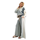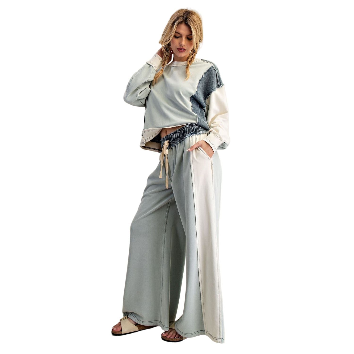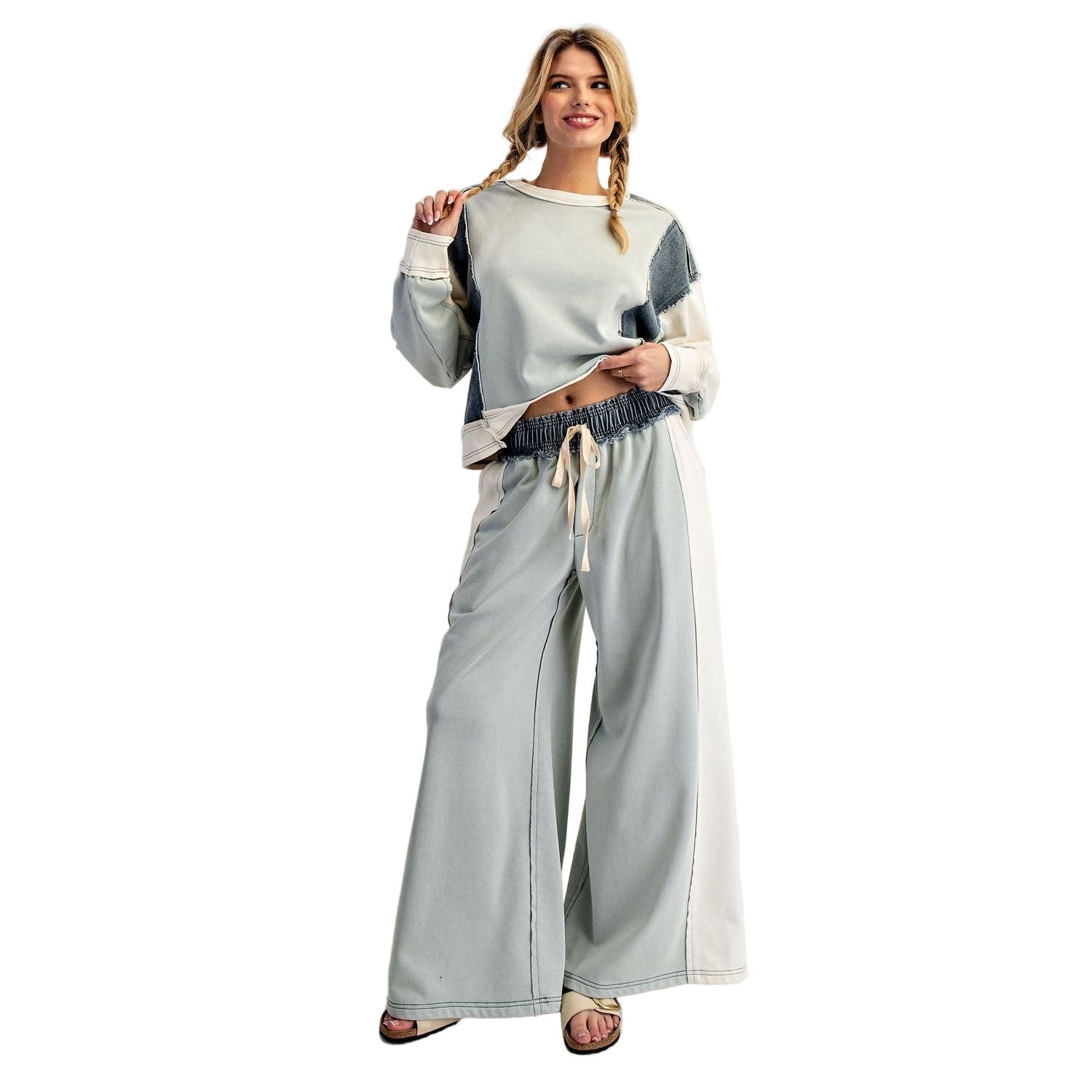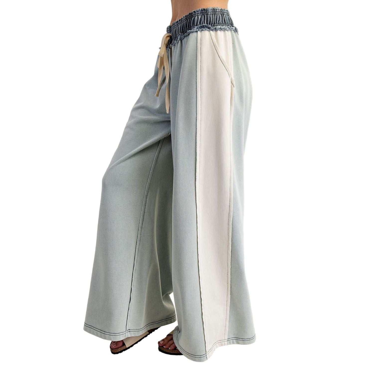 Product Detail: These color block pants feature contrast side panels, a denim drawstring waistband with frayed detailing, exposed seaming throughout, roomy side pockets, and a wide leg silhouette for a bold and laid back streetwear vibe.