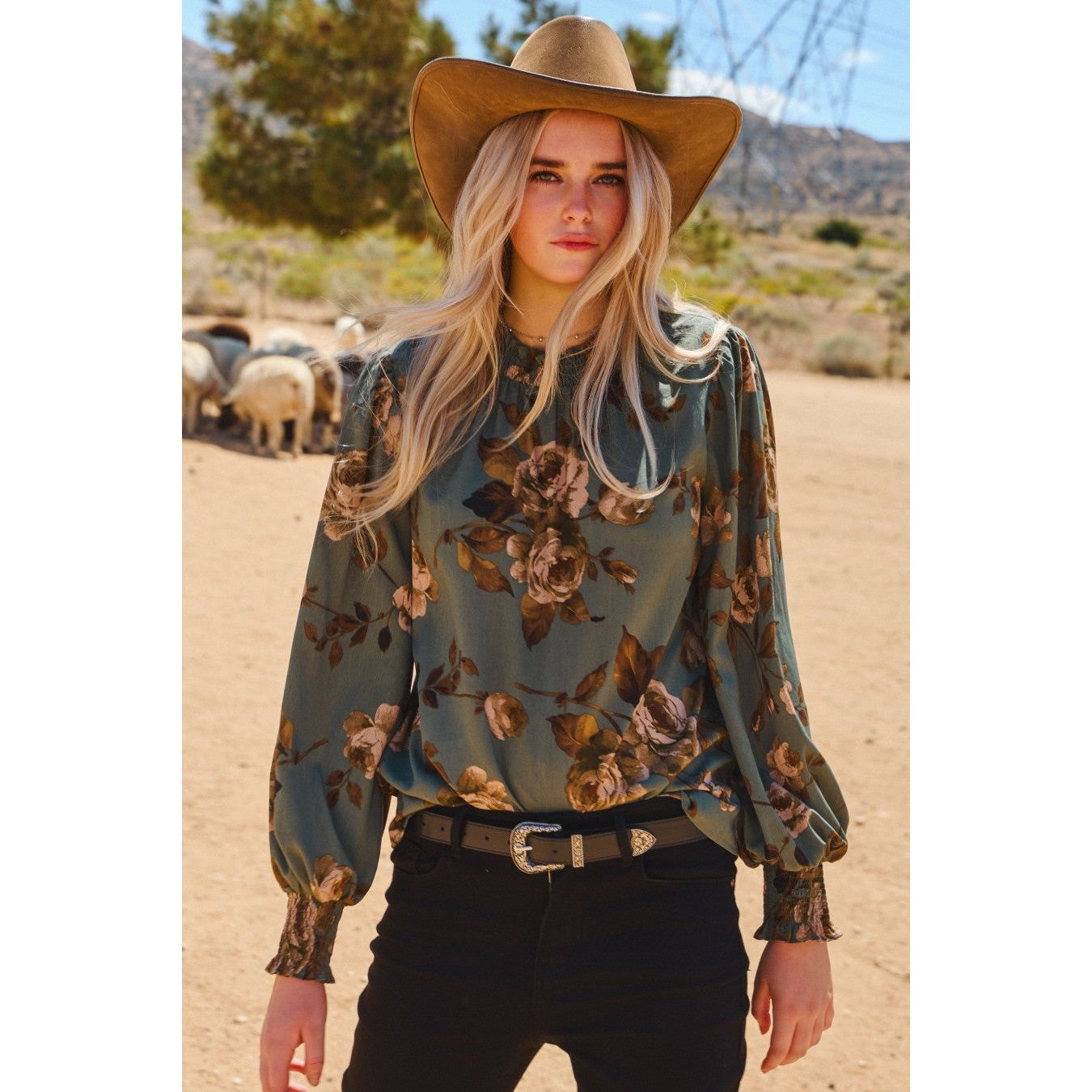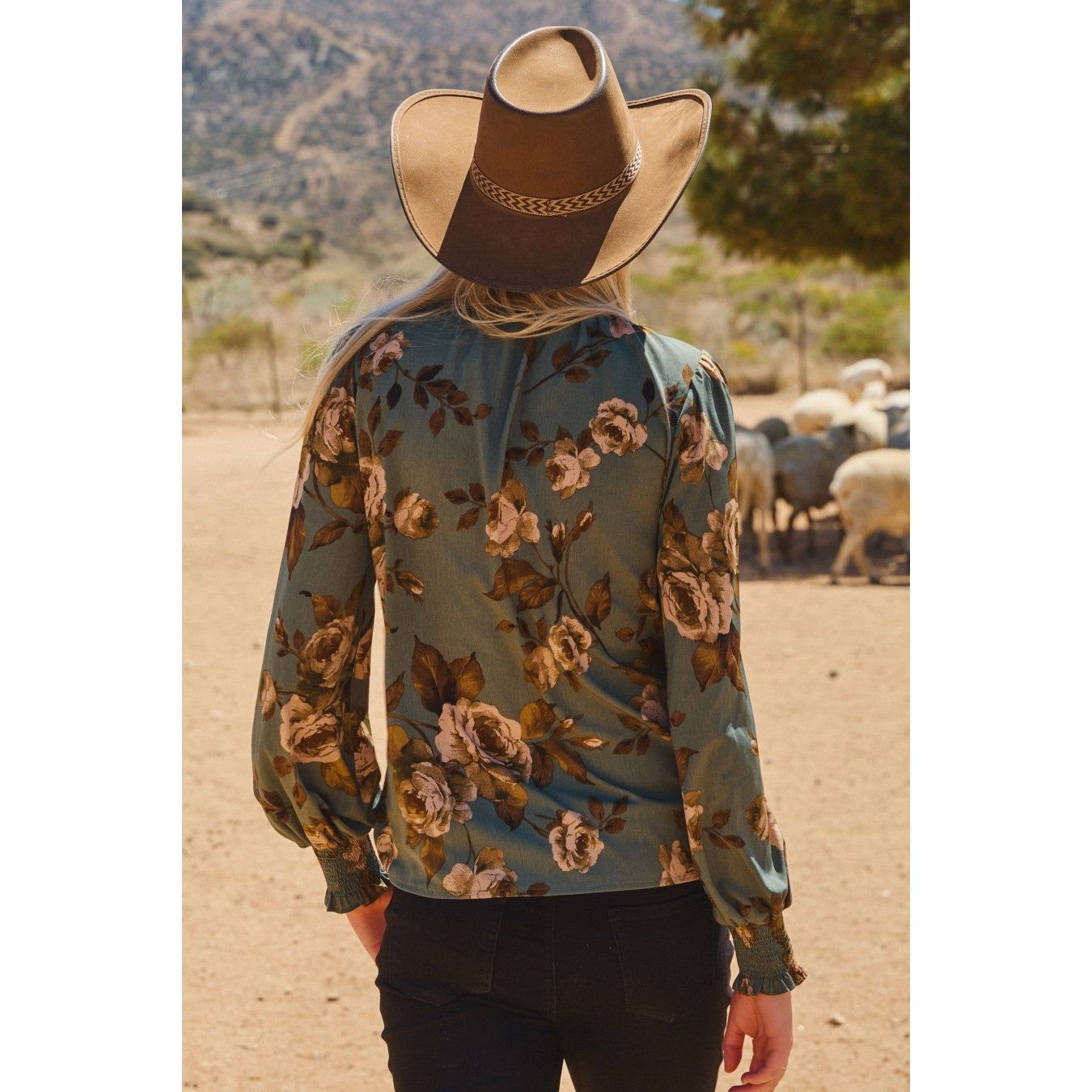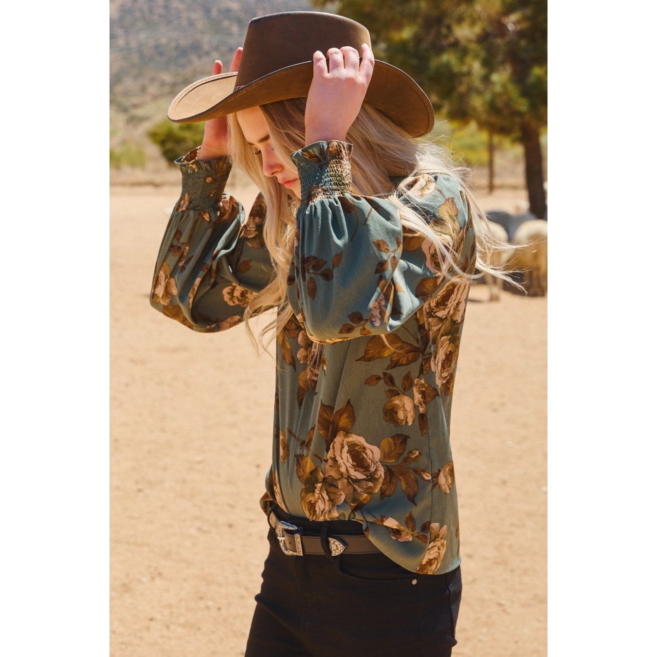 Floral printed blouse with smocked neckline and smocked cuffs. Also available in sizes 1XL to 3XL: Style no. IT18287P. Total Length:24" Content: 100% Polyester
