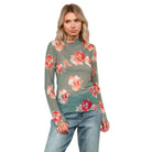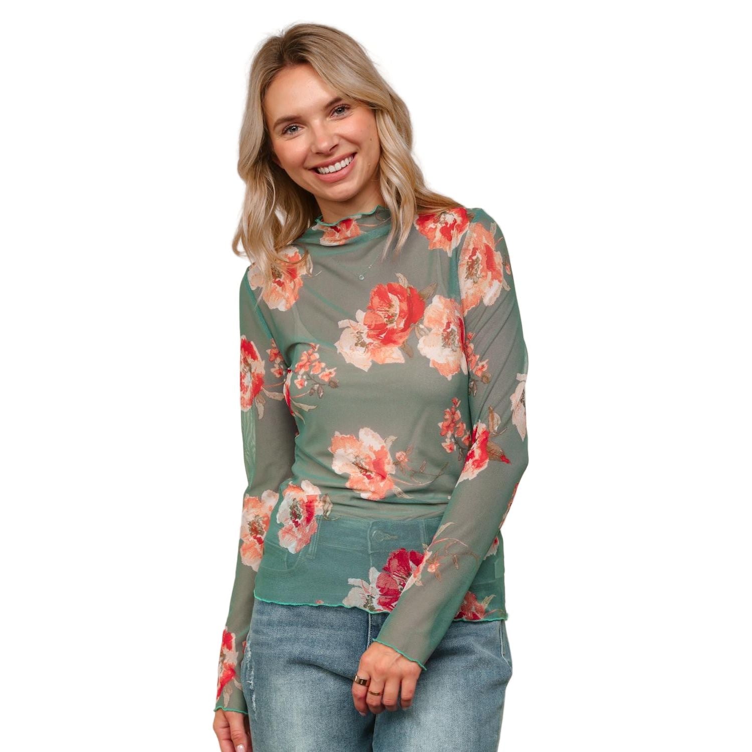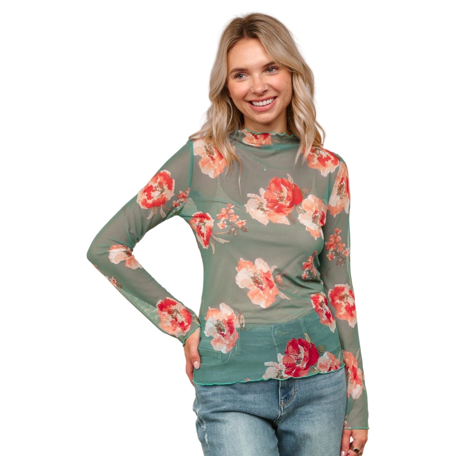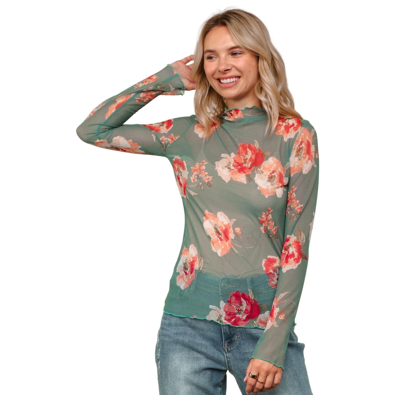 High neck line long sleeve floral print mesh semi sheer top with frilled