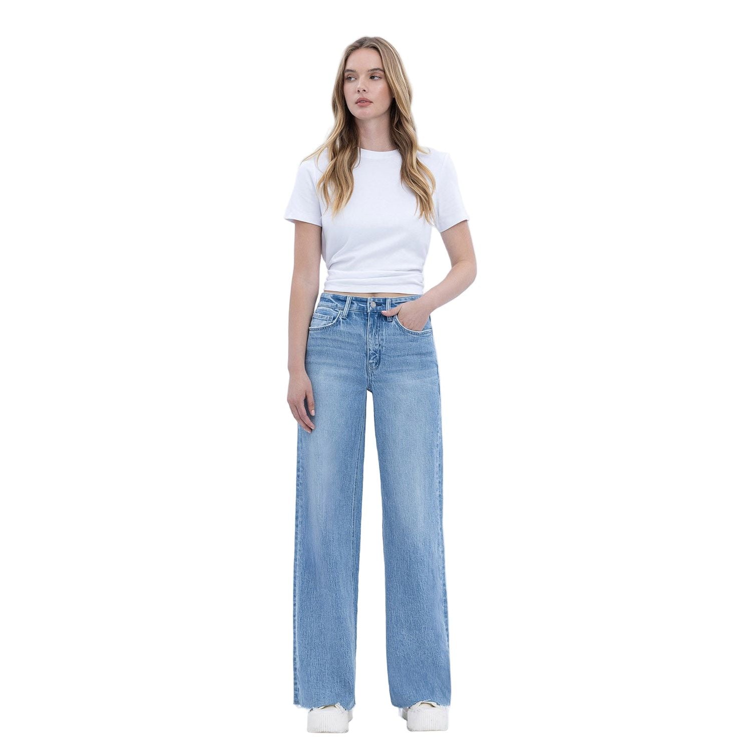 Women's High Rise Clean Cut Raw Hem Wide Jeans T6900