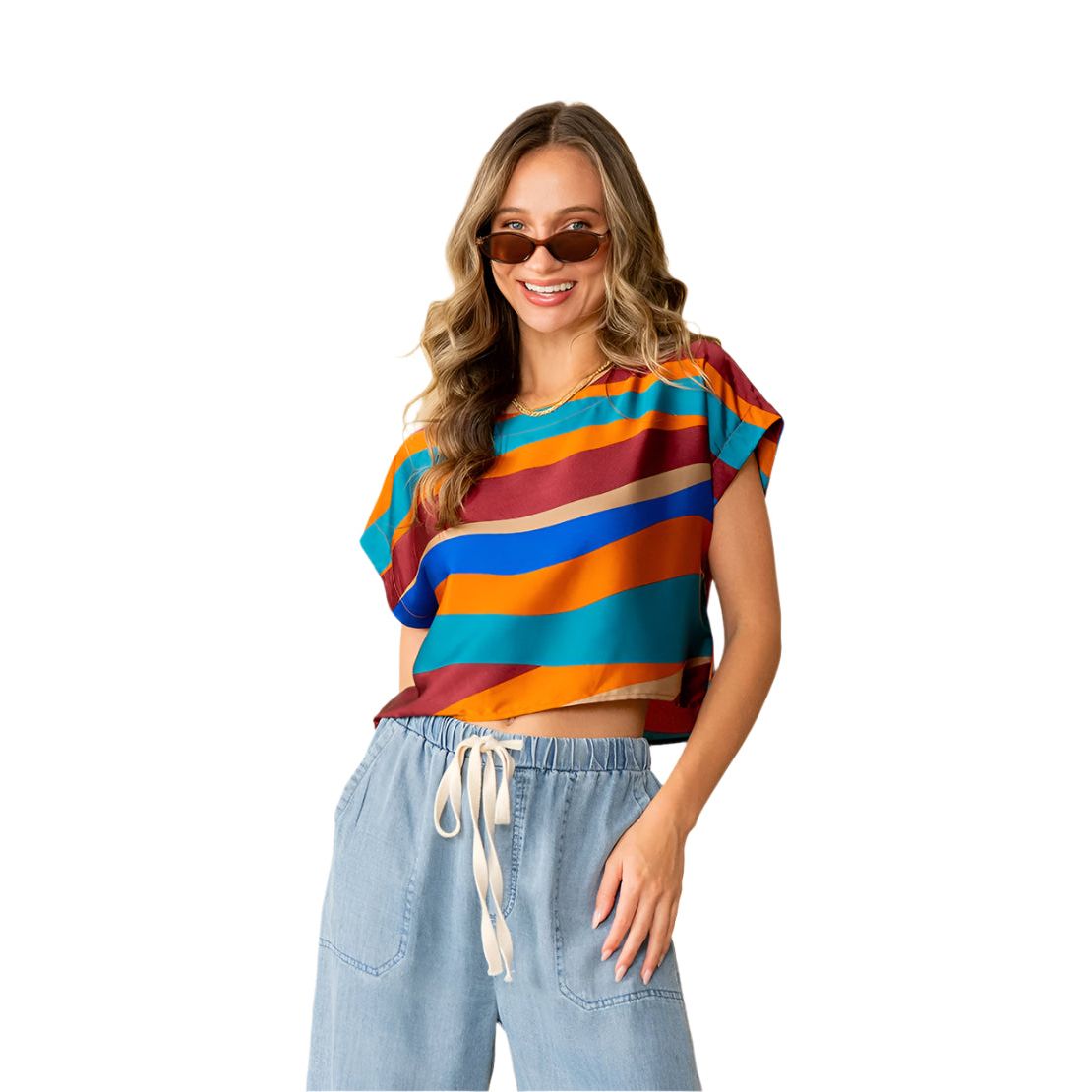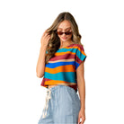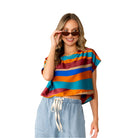 This eye-catching top features bold, wavy color block stripes in rich jewel tones for a retro-chic vibe. The relaxed fit and silky fabric offer effortless comfort, while the wide short sleeves and round neckline keep the look modern and versatile. Perfect for pairing with high-waisted pants or skirts for an easy statement outfit. * Style Number ET6162-5313W * Relaxed Fit * Cap Sleeves * Round Neck * Wavy Stripes * Satin Top Model is 5' 8 and wears a size Small