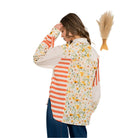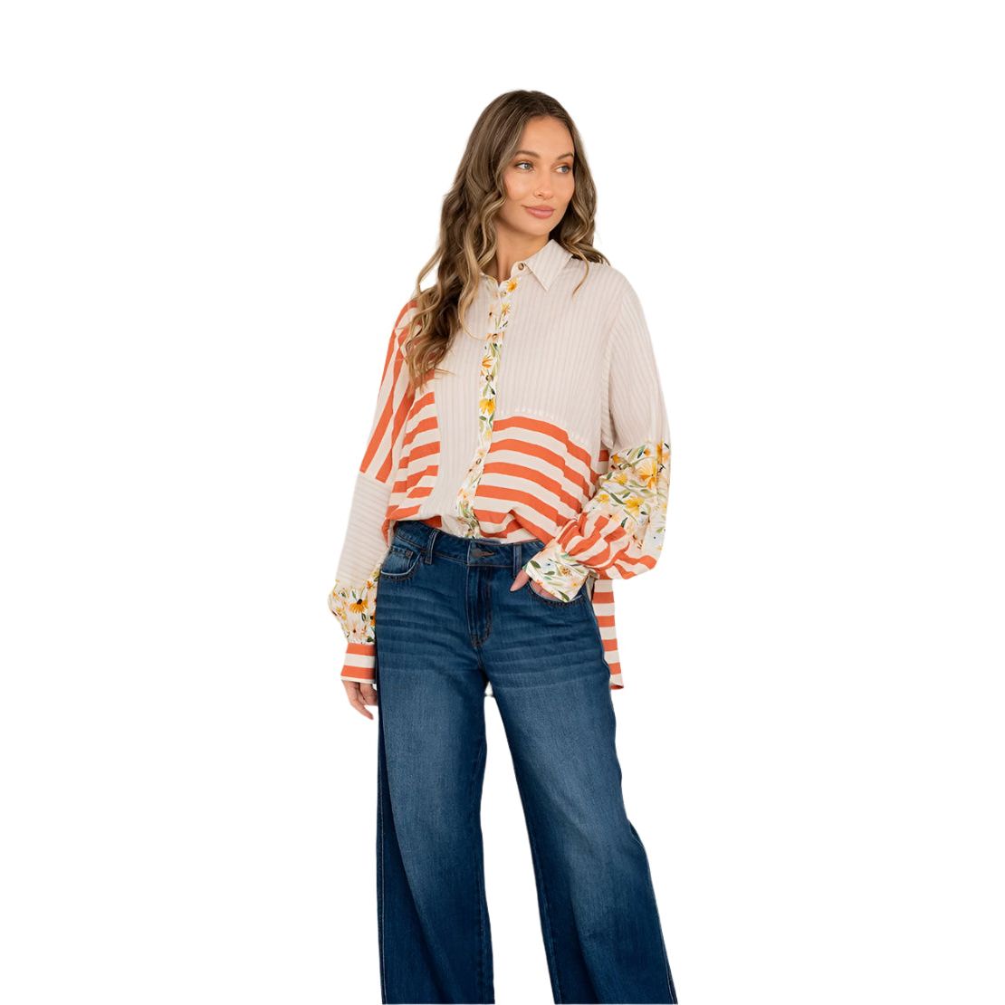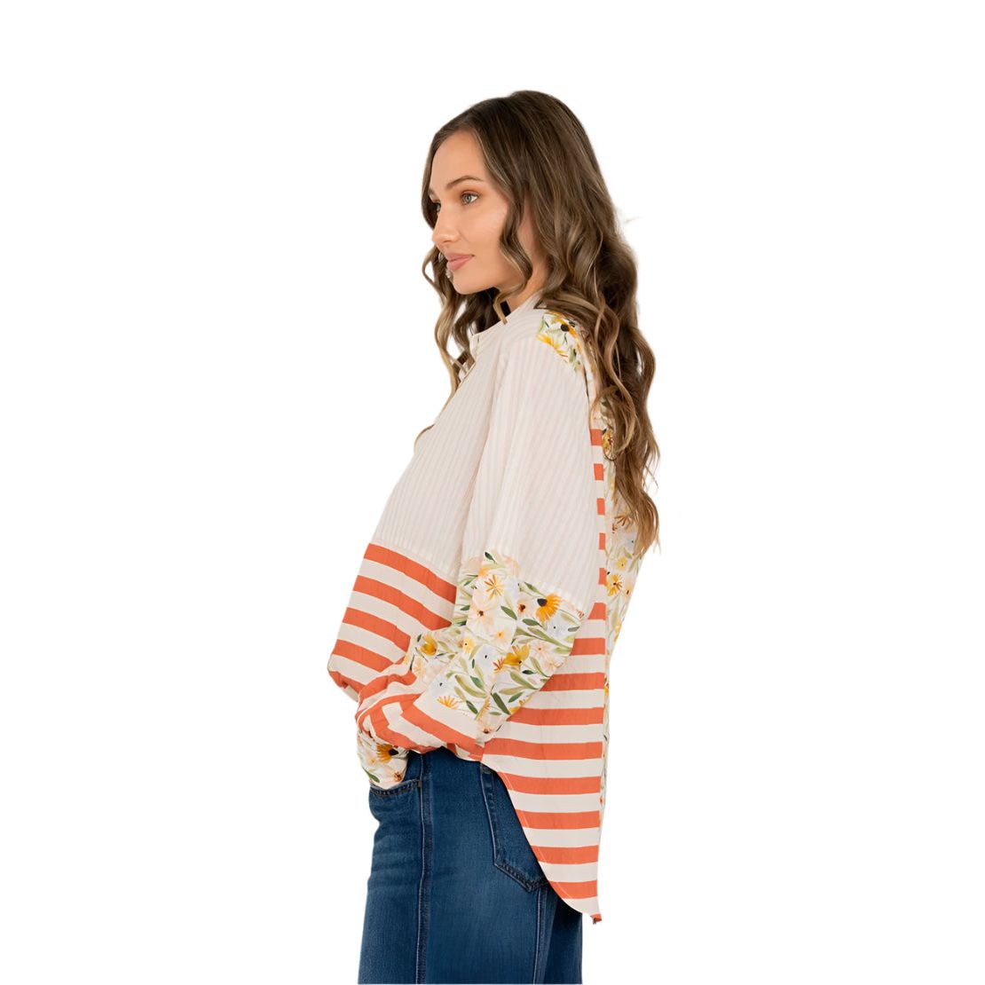 This mixed print button-down shirt brings a playful twist to a classic silhouette with bold rust stripes and vibrant floral panels. The lightweight fabric and relaxed fit offer an effortless, laid-back look perfect for casual days. Detailed with a collared neckline and curved hem, it's a standout piece for any season. * Style Number ET6319 * Relaxed Fit * Mixed Print * Button Down Shirt * Long Sleeves * Collared Neck * Stripes * Floral Print Model is 5' 8 and wears a size Small