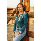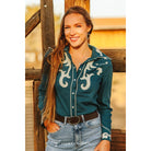 Women's Teal Ivory Patch Embroidered Boot Stitch Contrast Piping Button Down Shirt TO938-TL