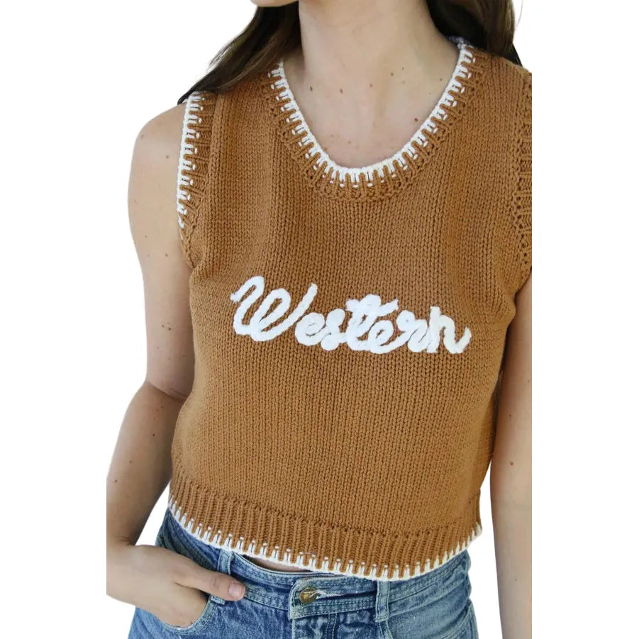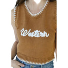 This trendy knit sweater vest blends Western-inspired style with casual comfort.