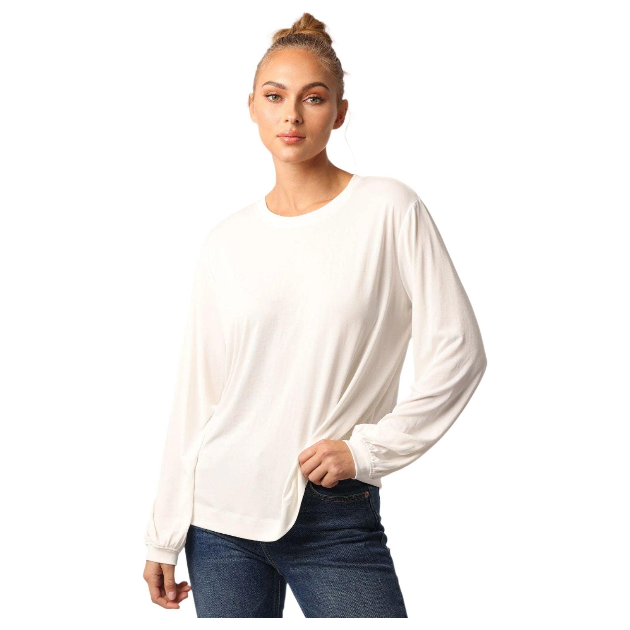 Basic long sleeve top with shirred finish. Pair with our So Me pants, for a cute but still comfy look. Solid color knit on relaxed fit.
