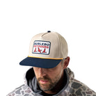 Classic meets rugged in The Outdoorsman Cap. A timeless staple built for everything from sunrise hikes to post hunt tailgates. Featuring a tan crown, navy bill, and a bold yellow rope across the front, this cap pairs traditional outdoor colors with standout details. The “BURLEBO Outdoors” patch front and center ties it all together, making it a go to for those who live life outside.