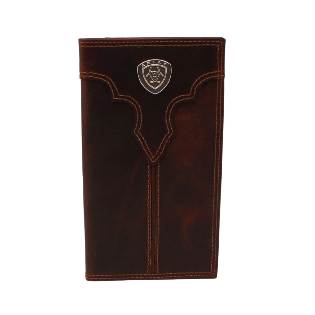 Stay both organized and in style with this Ariat rodeo wallet by M&F Western Products. Genuine leather with Ariat shield logo. Features multiple compartments for your credit cards, cash and ID.