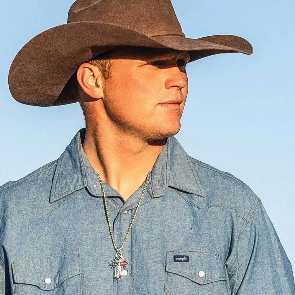 Introducing the God & Country American Made Necklace, a powerful symbol of patriotism and faith. This exquisite necklace features a striking silver cross adorned with a meticulously painted American flag at its center. Crafted with pride in the USA, this necklace embodies the spirit of the American West and the values it represents. The 26 inch wheat chain provides a classic, masculine look that pairs perfectly with any Western inspired outfit.