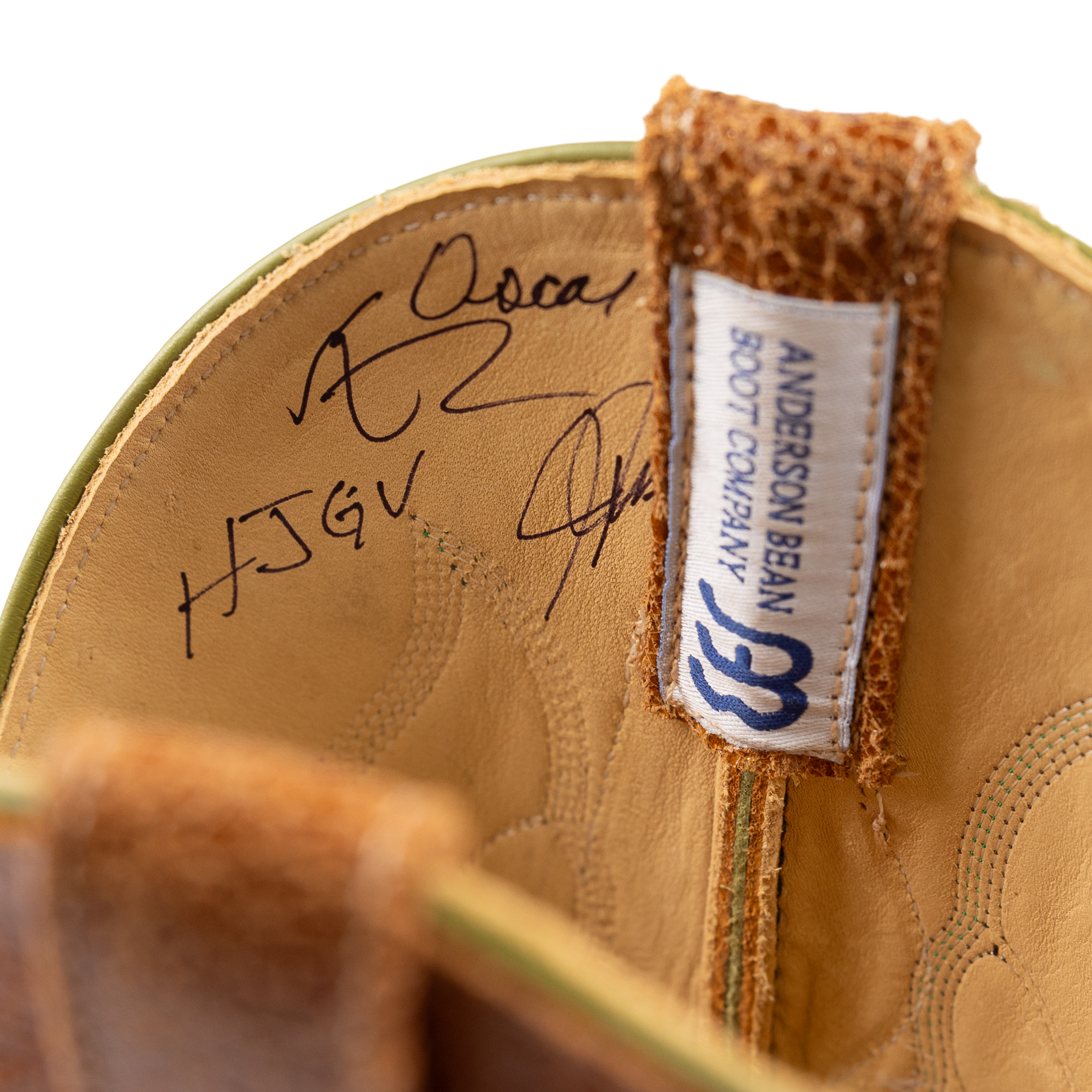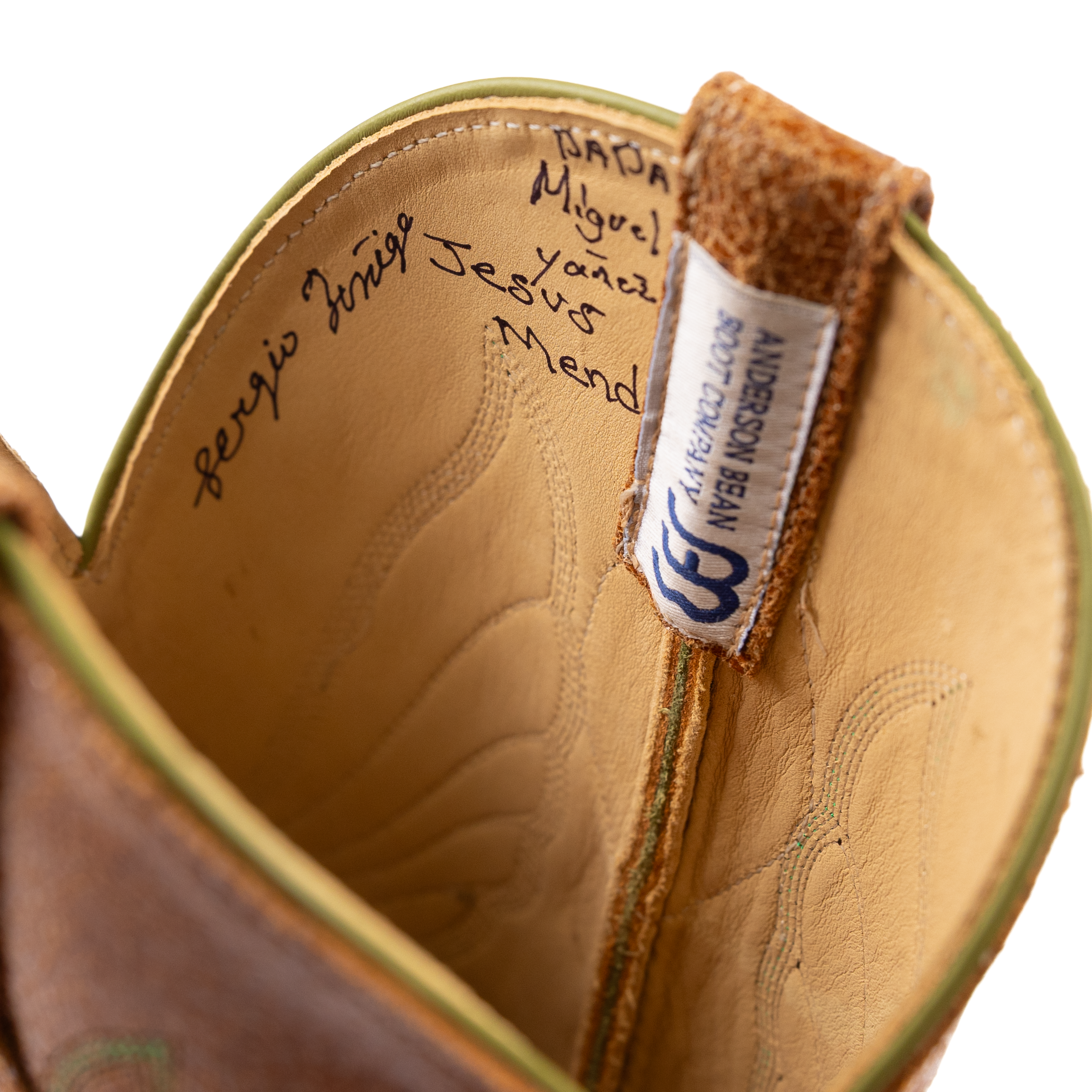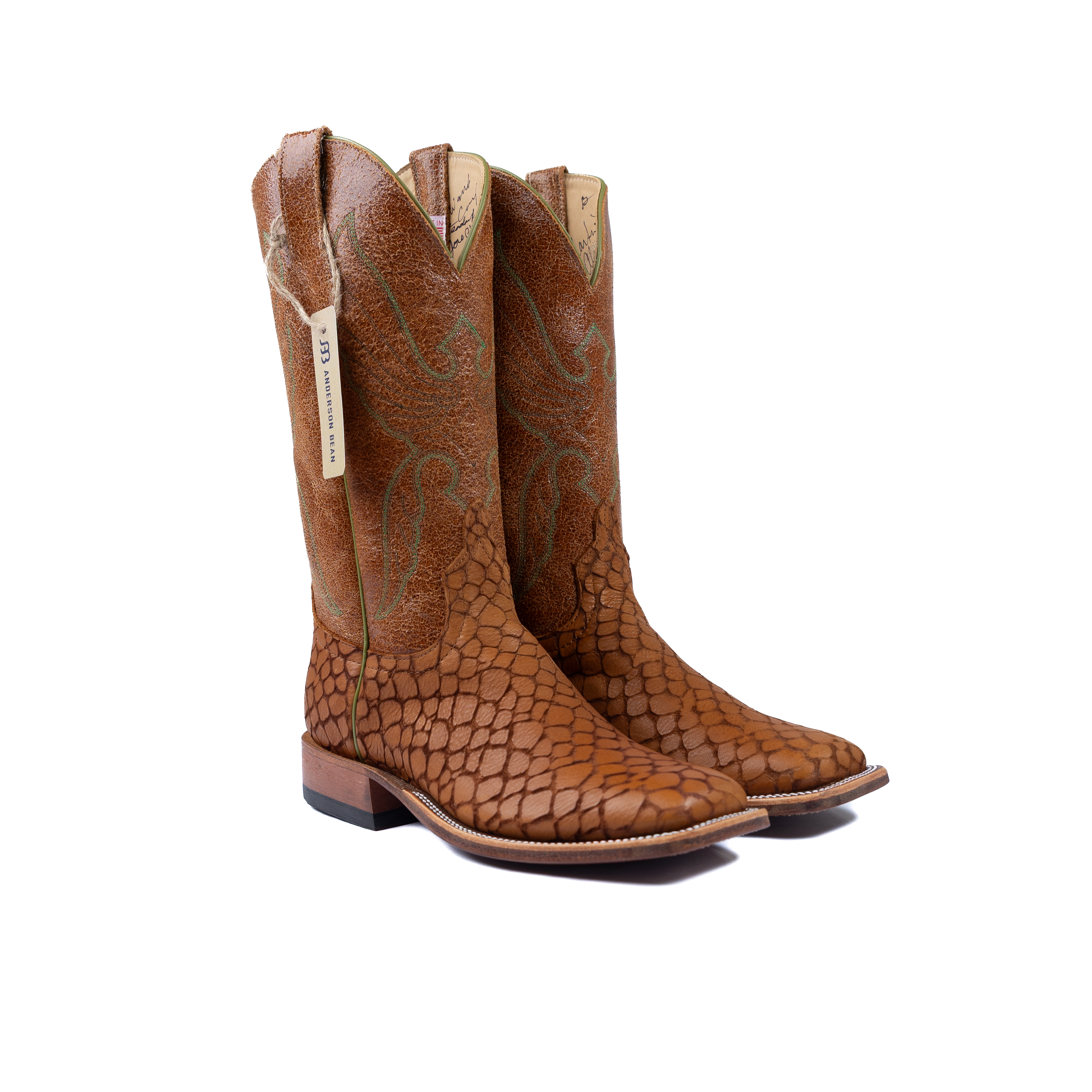 This is a special, limited edition Anderson Bean designed by Ryan Vaughan. It features the first butyl sole ever put on an Anderson Bean. The soles are injected with butyl to increase their resistance to water and make a full leather sole much more durable. The pulls and stitch pattern are classic designs from Rios of Mercedes. Additionally, the inside of each boot features the signatures of the boot makers in the Anderson Bean factory with 20 years of experience or more. The vamp, Lochness Monster, is an Italian cowhide treated with acid to create an etched effect.