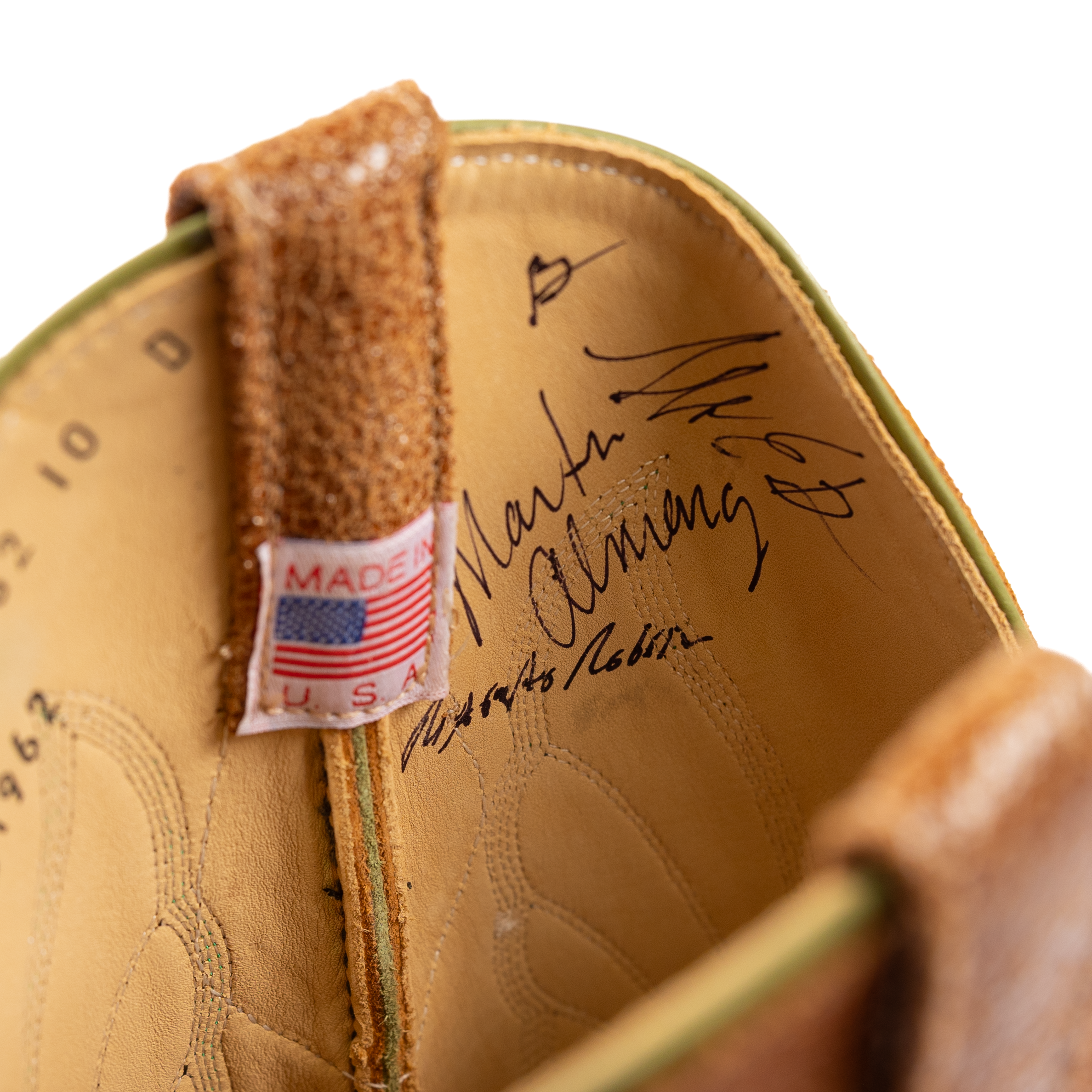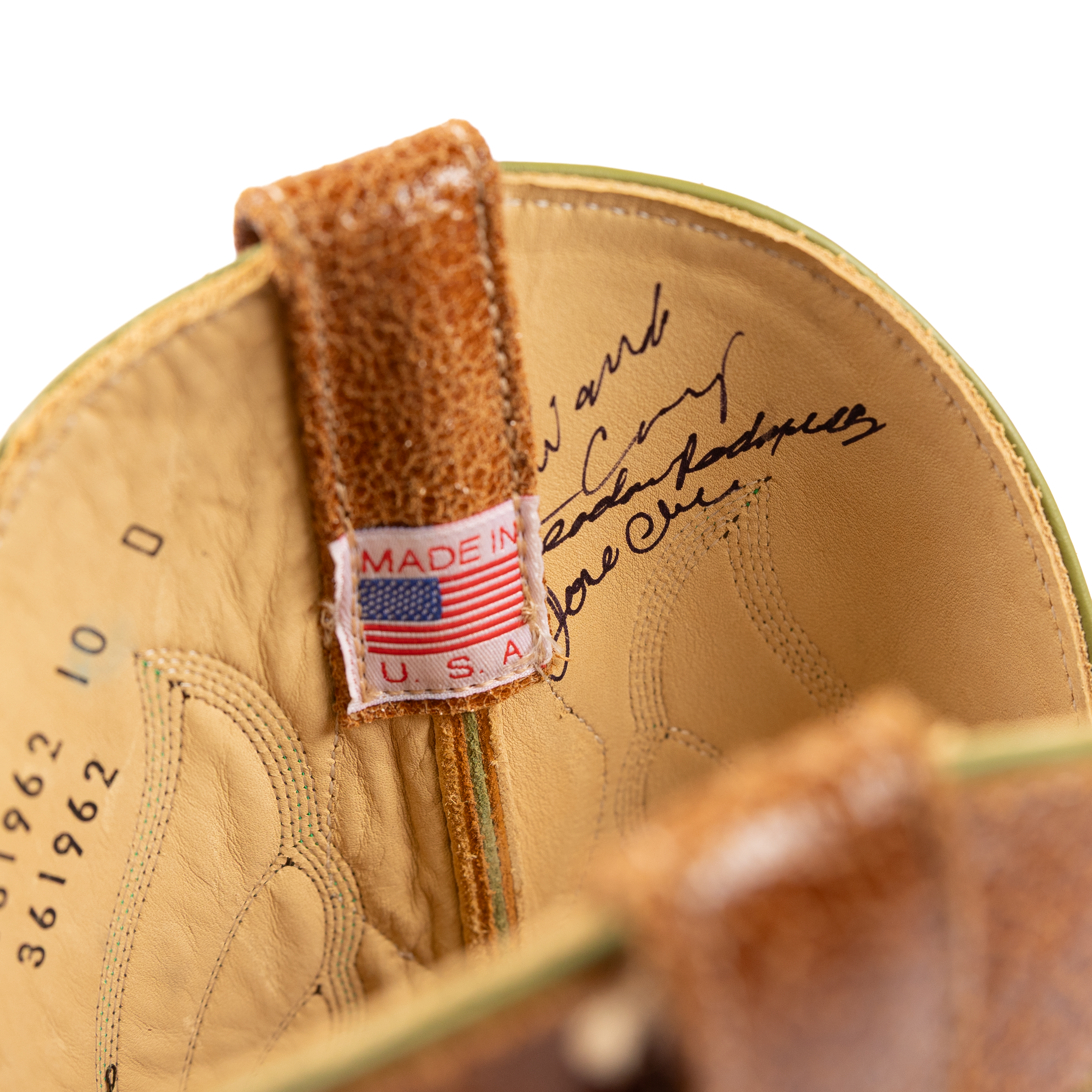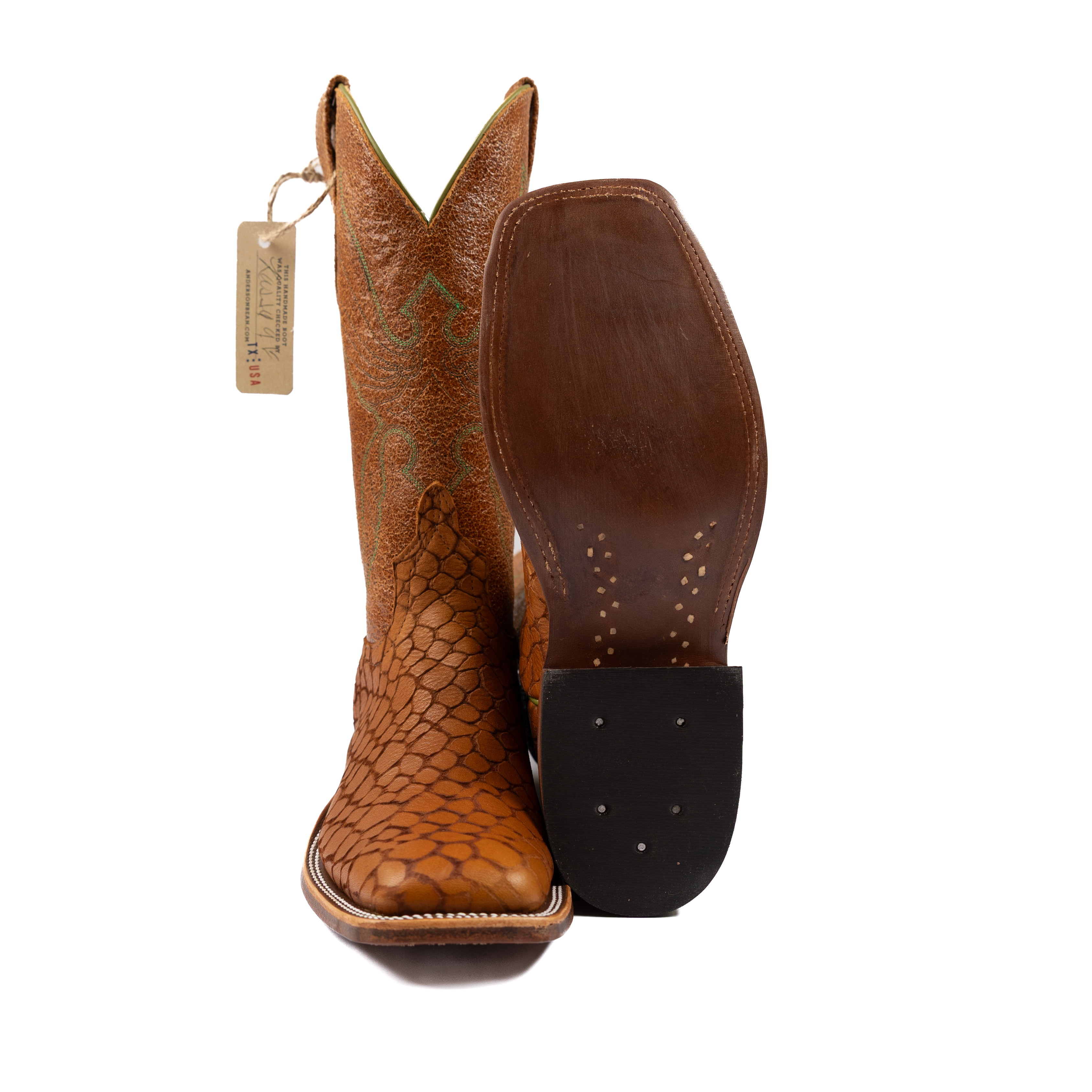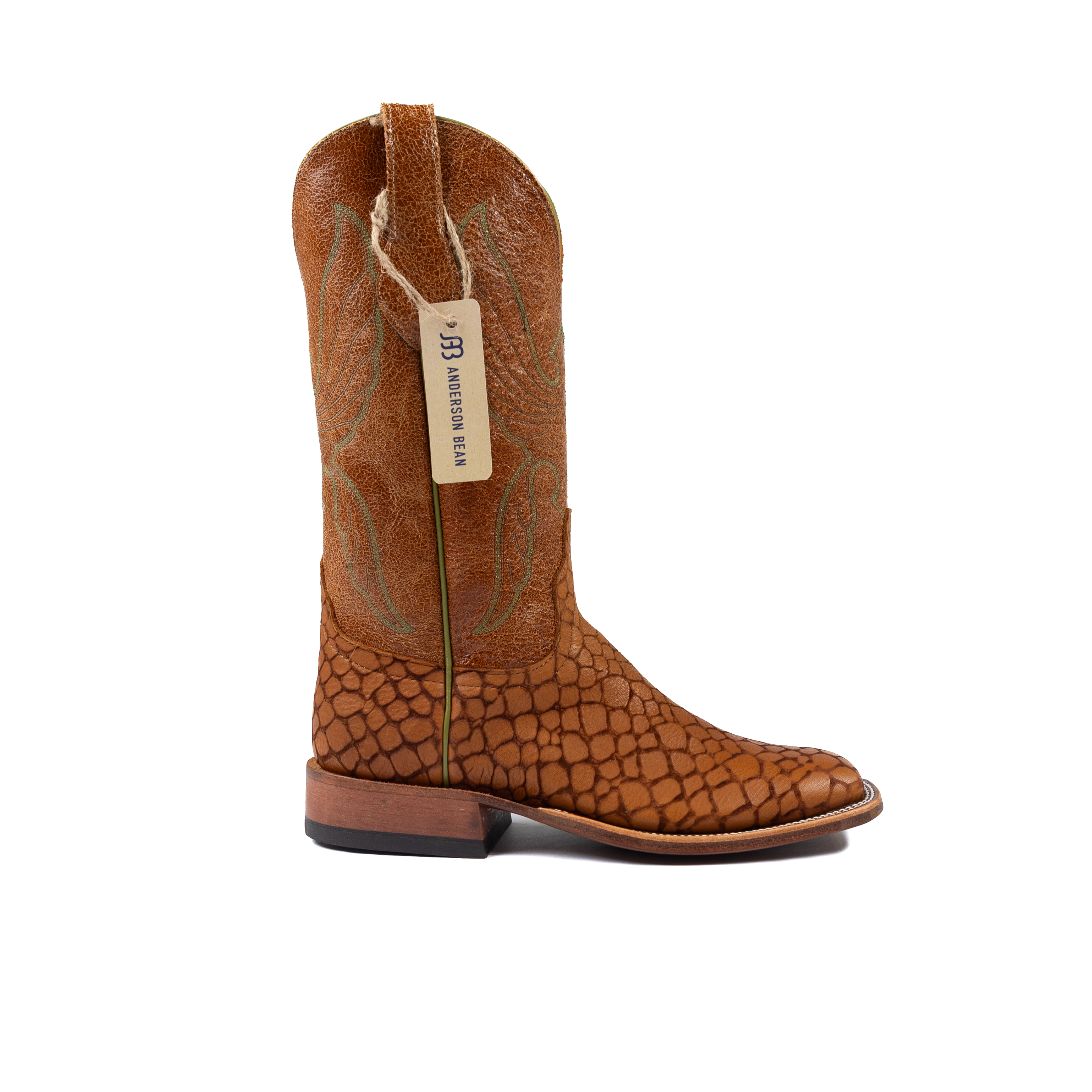 This is a special, limited edition Anderson Bean designed by Ryan Vaughan. It features the first butyl sole ever put on an Anderson Bean. The soles are injected with butyl to increase their resistance to water and make a full leather sole much more durable. The pulls and stitch pattern are classic designs from Rios of Mercedes. Additionally, the inside of each boot features the signatures of the boot makers in the Anderson Bean factory with 20 years of experience or more. The vamp, Lochness Monster, is an Italian cowhide treated with acid to create an etched effect.