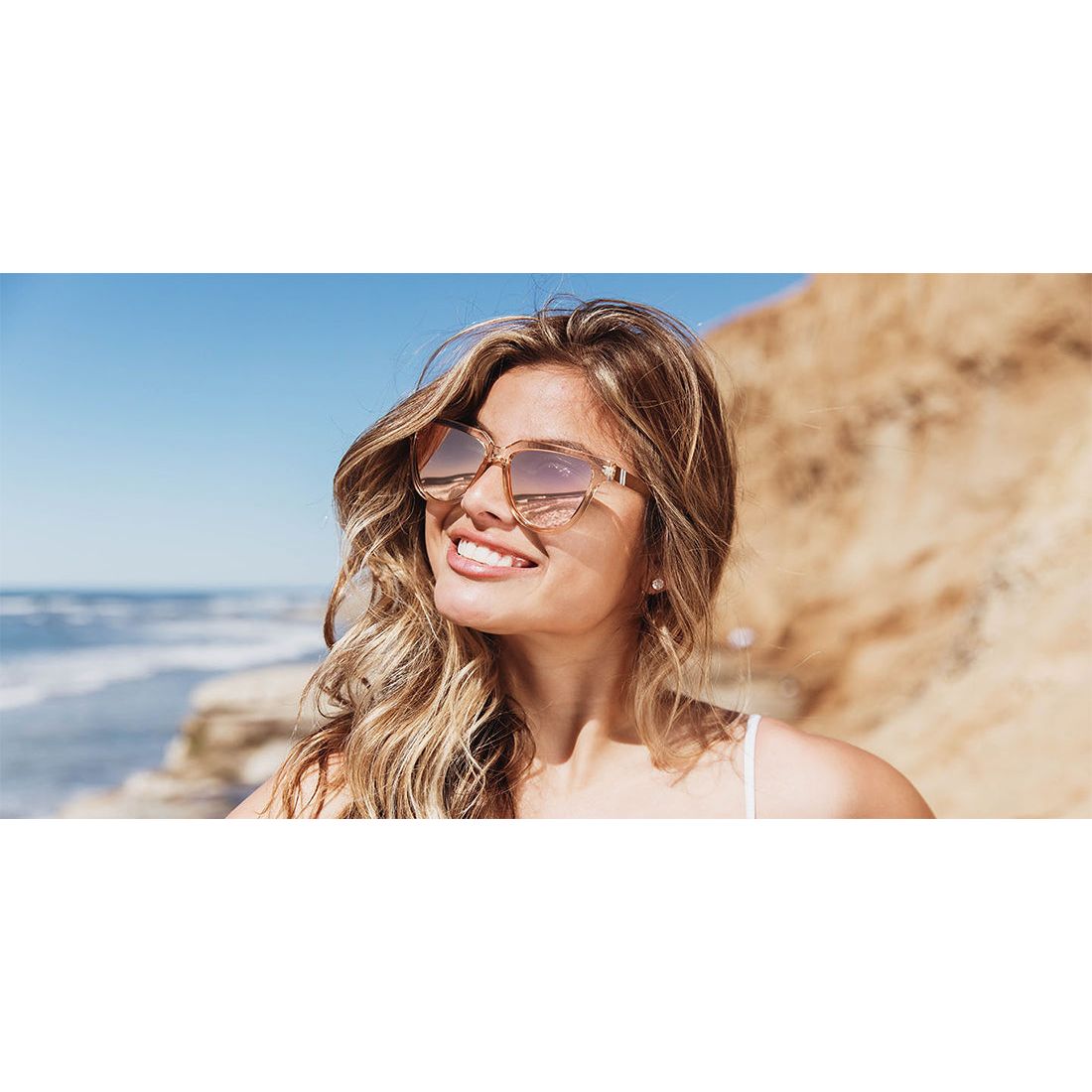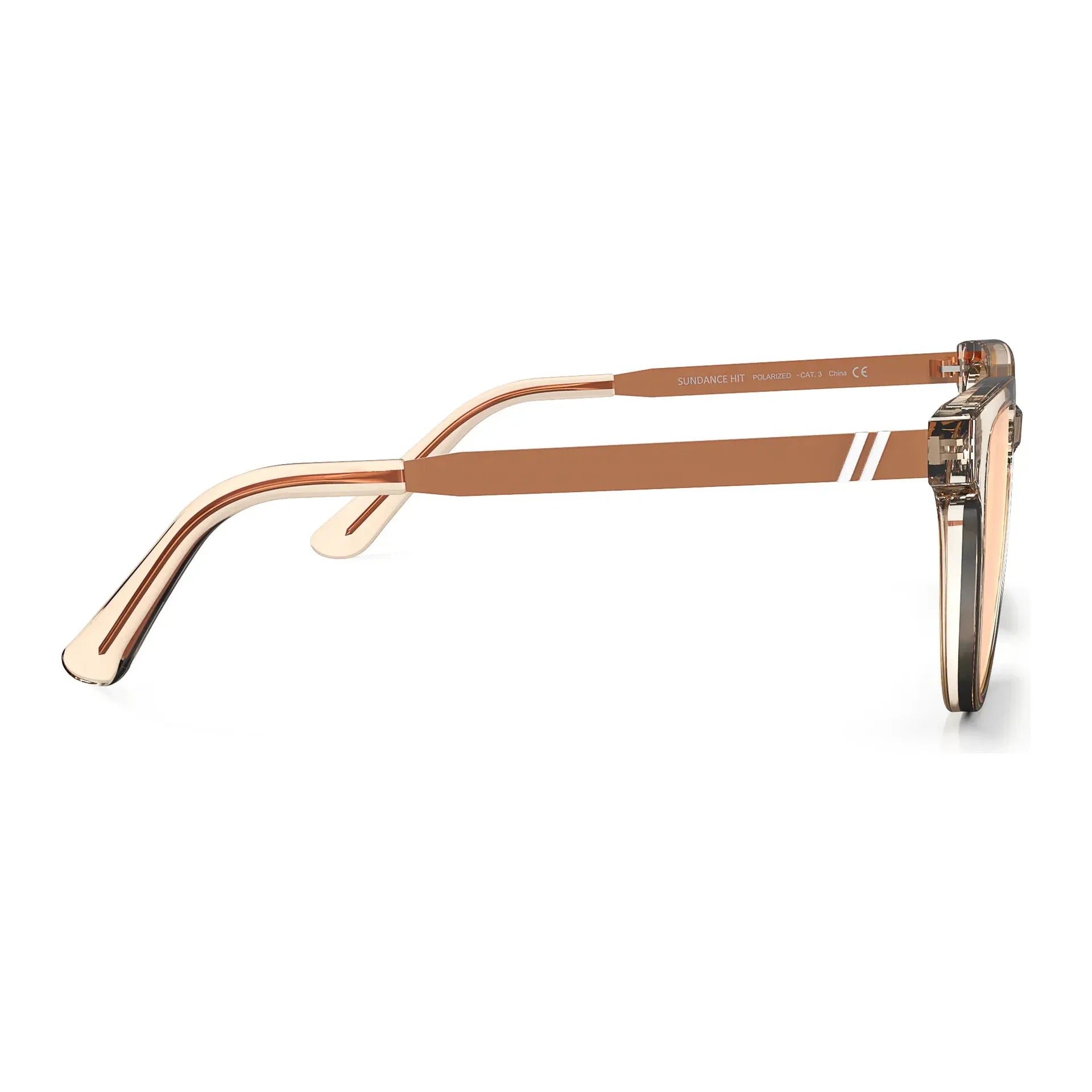 'Sundance Hit' sets the stage for good times. The champagne lenses are polarized to reduce glare and improve outdoor visibility, while the Champagne-colored temples are made of metal for a sophisticated dose of durability. And as with all our Blendz, these sure as hell look the part, with a semi-transparent, glossy peach frame and a set of crystal clear ear rests that dazzle with their tone-matching tortoise pattern. Whether at the beach or on the festival circuit, ‘Sundance Hit’ shines.
