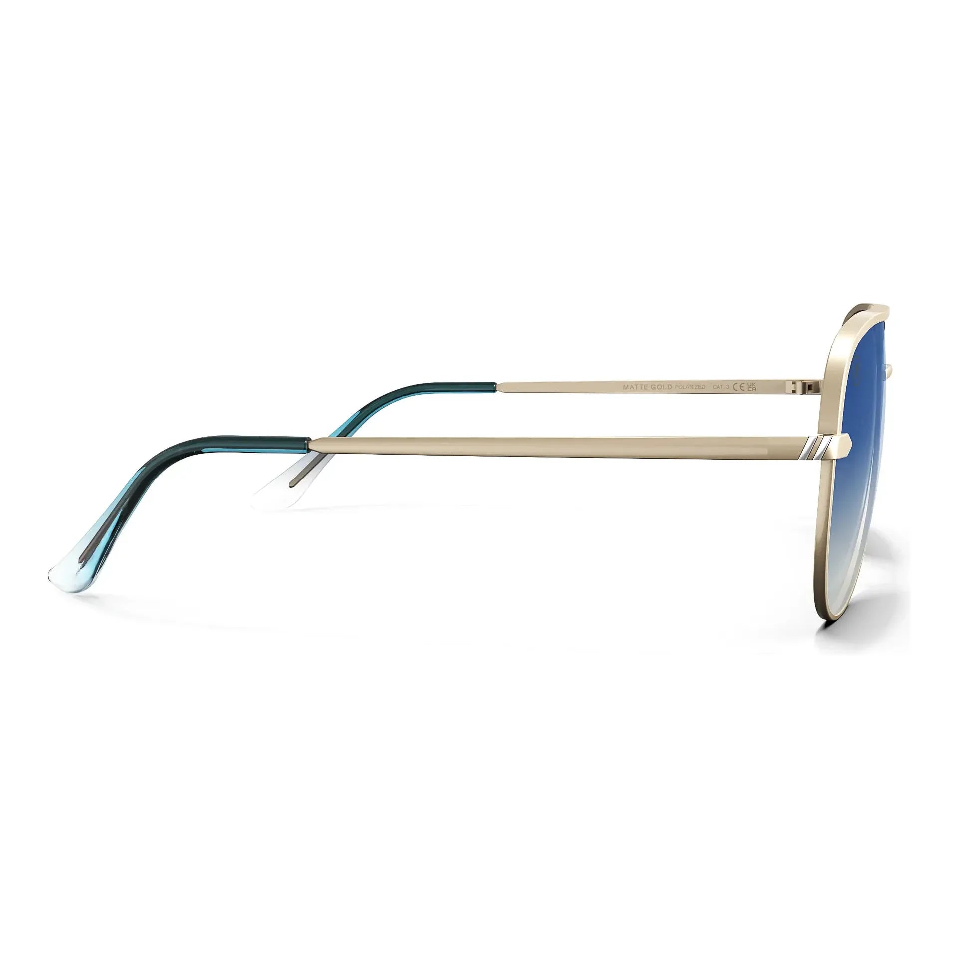 Matte Gold' nails the details with a matte gold frame and navy blue gradient lenses. There’s a slick, subtle fade from blue to crystal clear at the ear tips — and don’t sweat performance. These shades deliver polarized power for glare-free days.
