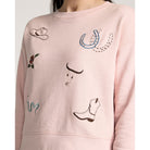 A soft cotton-blend pullover with Western graphic detailing across the chest and sleeves. The crewneck silhouette and relaxed fit make this an easy piece to throw on with jeans or joggers for a cozy, casual style.