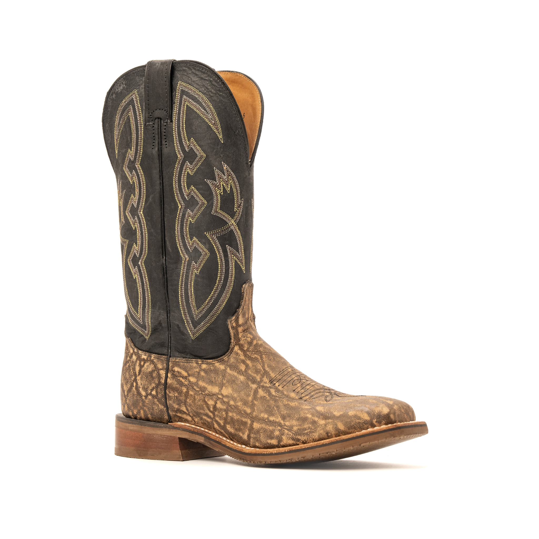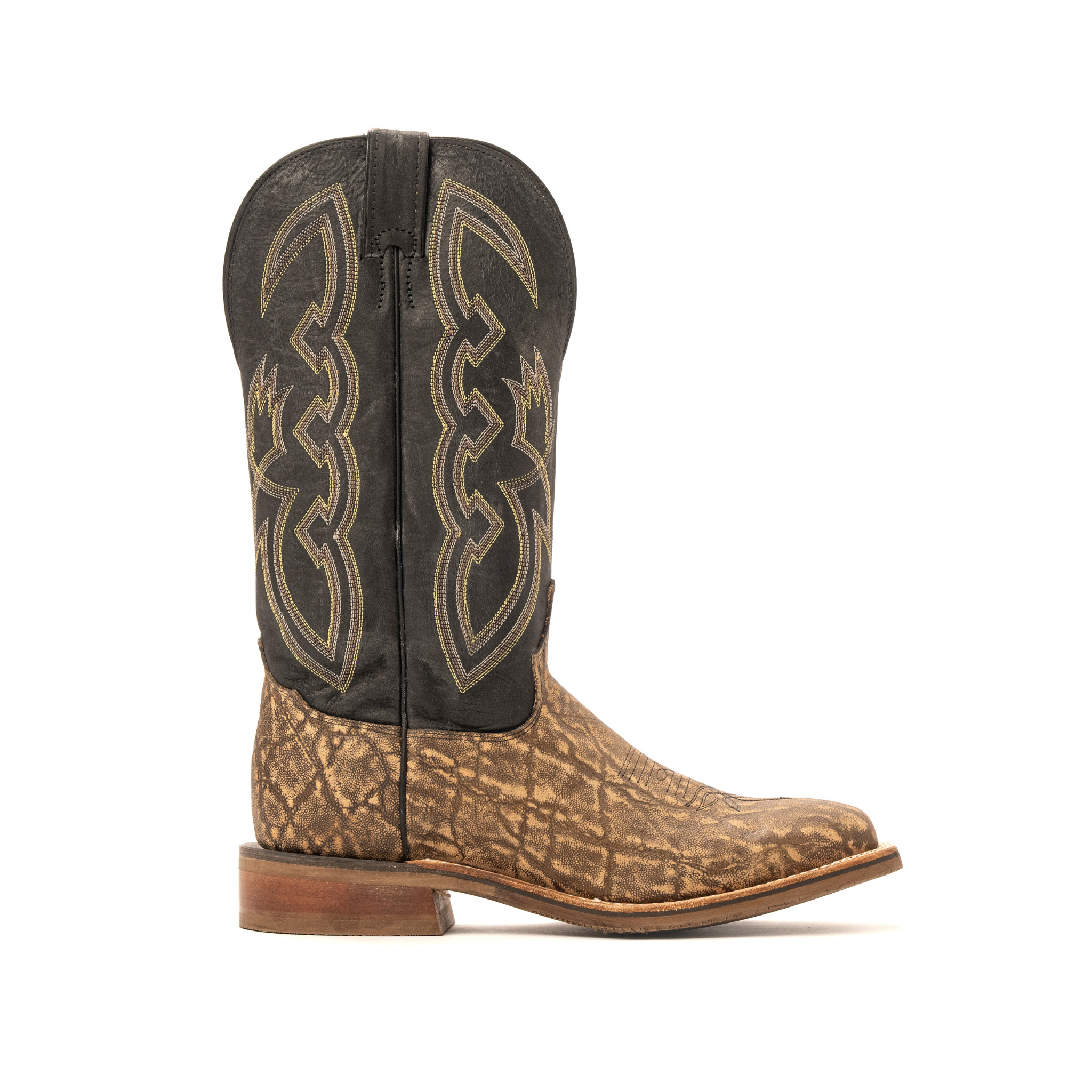 The Men’s Tony Lama Elephant Print Boots are a new look that can handle work and play. This pair of western boots has a taupe foot with a soft feel and an elephant print design. The 12” shaft is black with multicolor stitching. With comfort in mind, the square toe boots have an orthotic cushion, a 1.25” walking heel, and a nonslip rubber outsole.