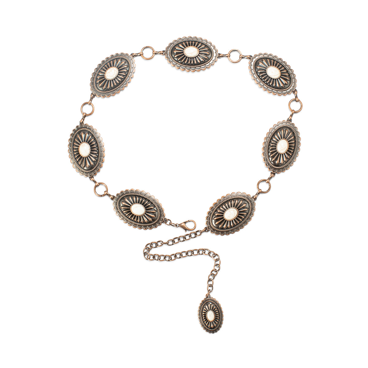 Description: This ladies Ariat chain belt by M&F Western Products is so stylish and has lots of character. Conchos have a white stone in the center and a rope edge around the center of the concho. Fastens with a lobster claw clasp.