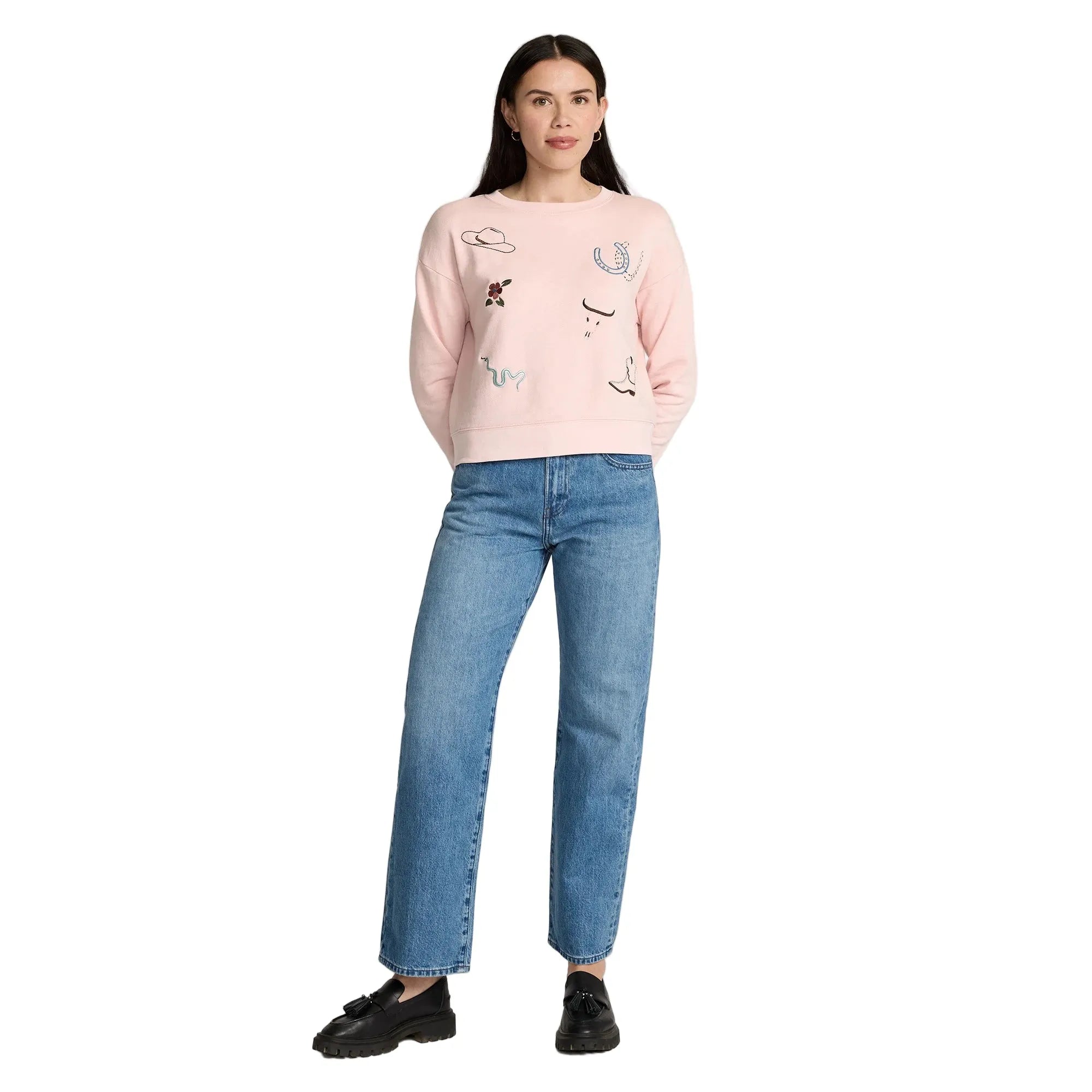 A soft cotton-blend pullover with Western graphic detailing across the chest and sleeves. The crewneck silhouette and relaxed fit make this an easy piece to throw on with jeans or joggers for a cozy, casual style.