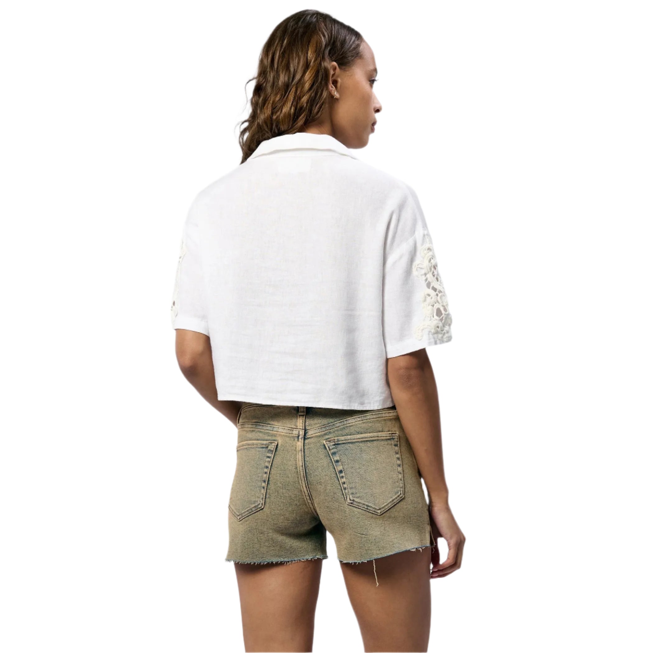 Darby novelty shirt with embroidery sleeve to supplement your wardrobe fashion, a versatile outfit essential crafted for both style and comfort. This button-up short sleeve top features a relaxed fit, offering a relaxed yet chic silhouette perfect for any occasion. Made from a breathable blend of linen and cotton, it ensures you stay comfortable throughout the day, an ideal choice for seeking comfort. Whether paired with jeans for a laid-back look or dressed up with a skirt, this top is the epitome of effortless style.