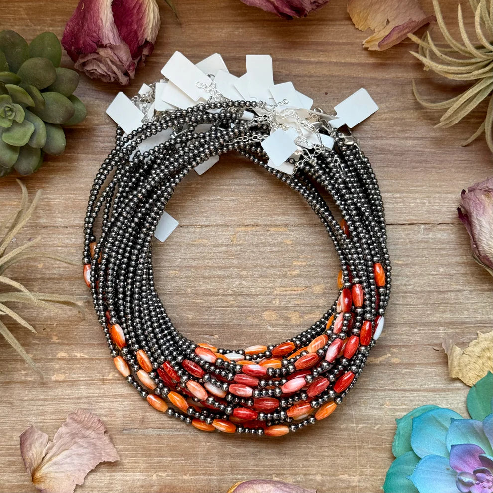 This vibrant Spiny Oyster choker is handmade by The Bijoux FAB using a mix of 3 mm and 4 mm rice-shaped spiny oyster beads in warm shades of orange and red. Each necklace is created with natural shell, so your piece may lean more red or more orange — making every choker beautifully unique. Finished with sterling silver beads, clasp, and a 2-inch extender, it’s easy to adjust and perfect for layering or wearing solo.