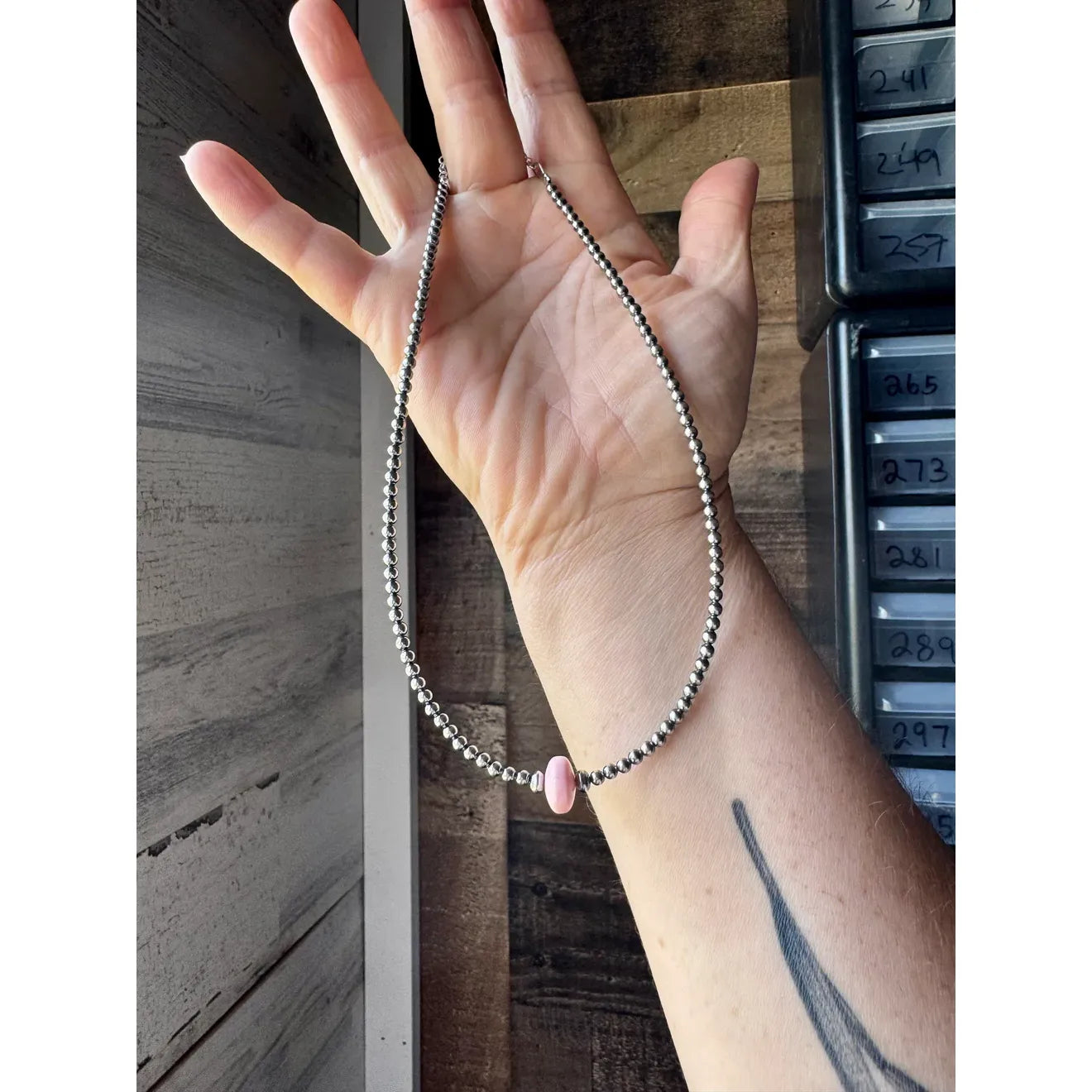 A dainty yet striking choker designed to highlight the beauty of natural pink conch. This 14.5-inch necklace features all sterling silver pearls in 3mm, with a bold 10mm saucer-shaped pink conch bead at the center. Framing the conch are two 4mm sterling silver saucers on each side. Comes with an extender for added length and comfort. Each pink conch bead displays unique color variations due to the natural shell material.