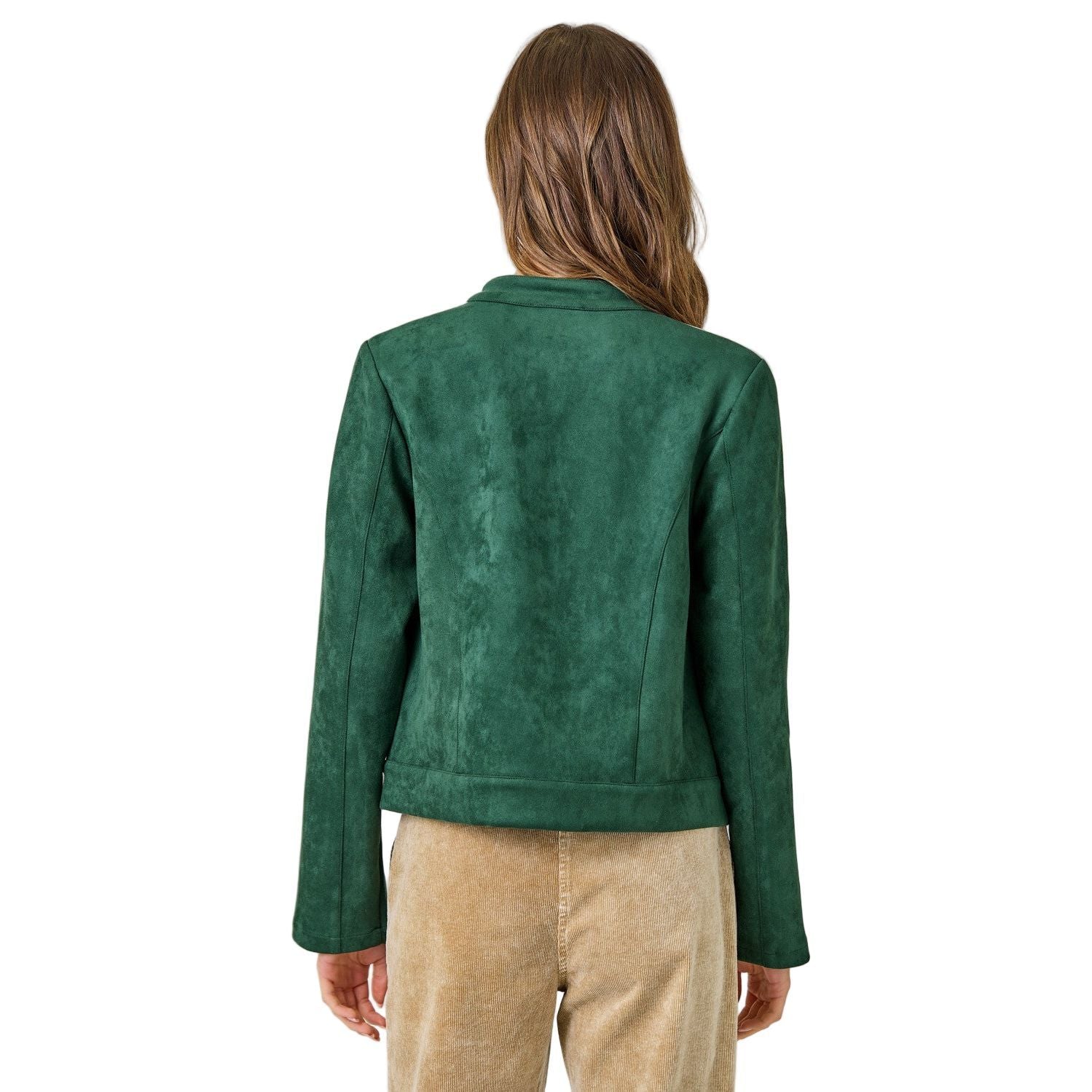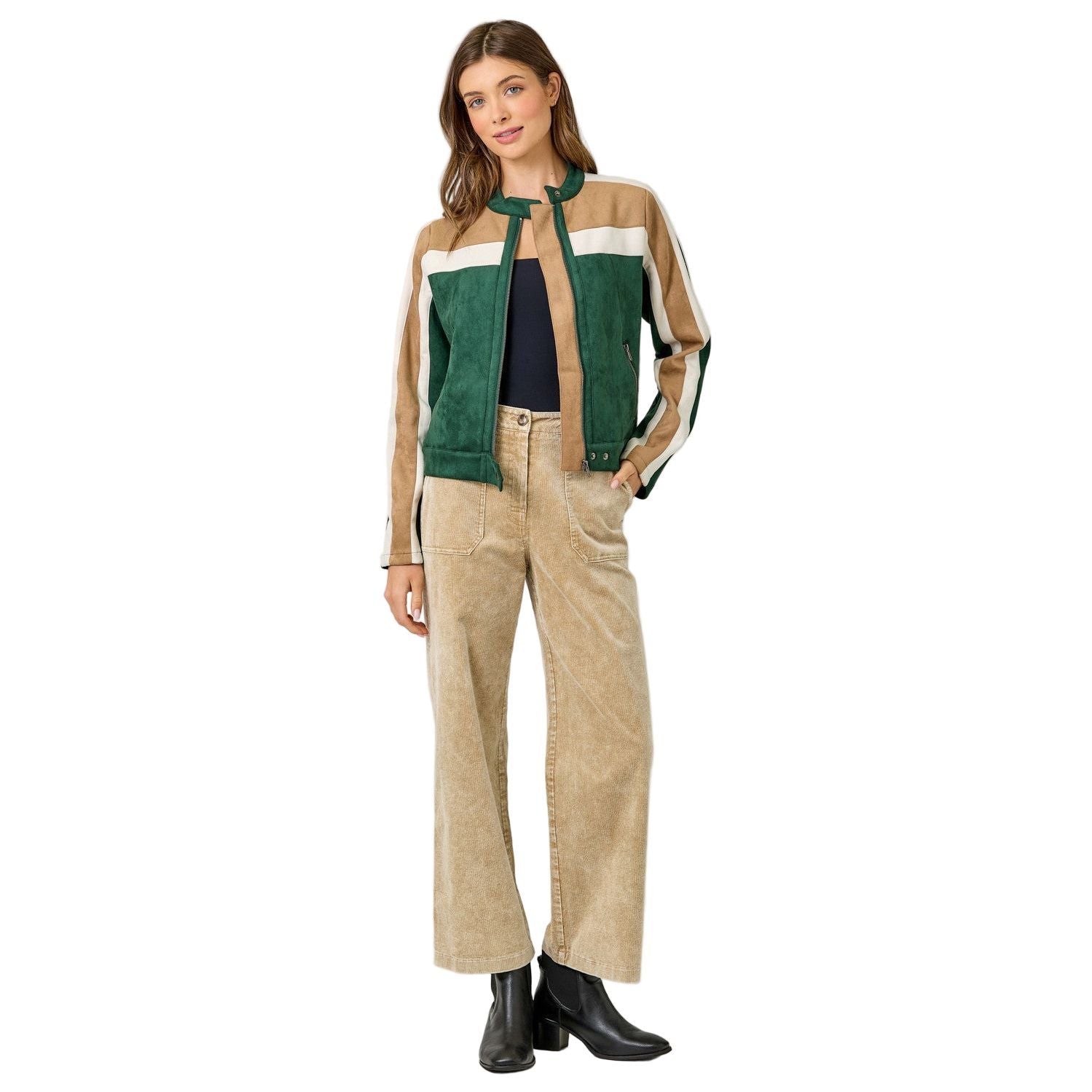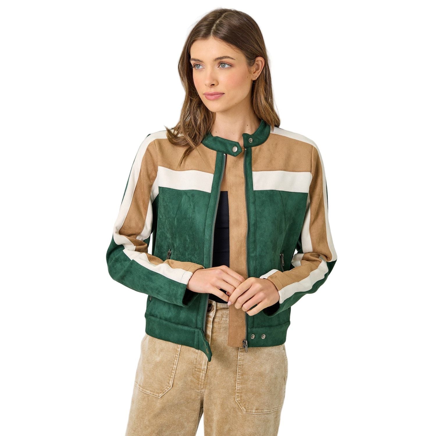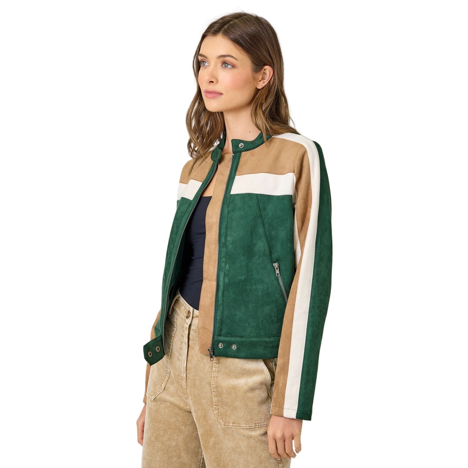 Color Blocked Moto Jacket Zipper front Zipper side pockets Snap button details Faux suede -Self & Contrast 1-2 90% Polyester, 10% Spandex -Model wears: S / Model height: 5' 9"