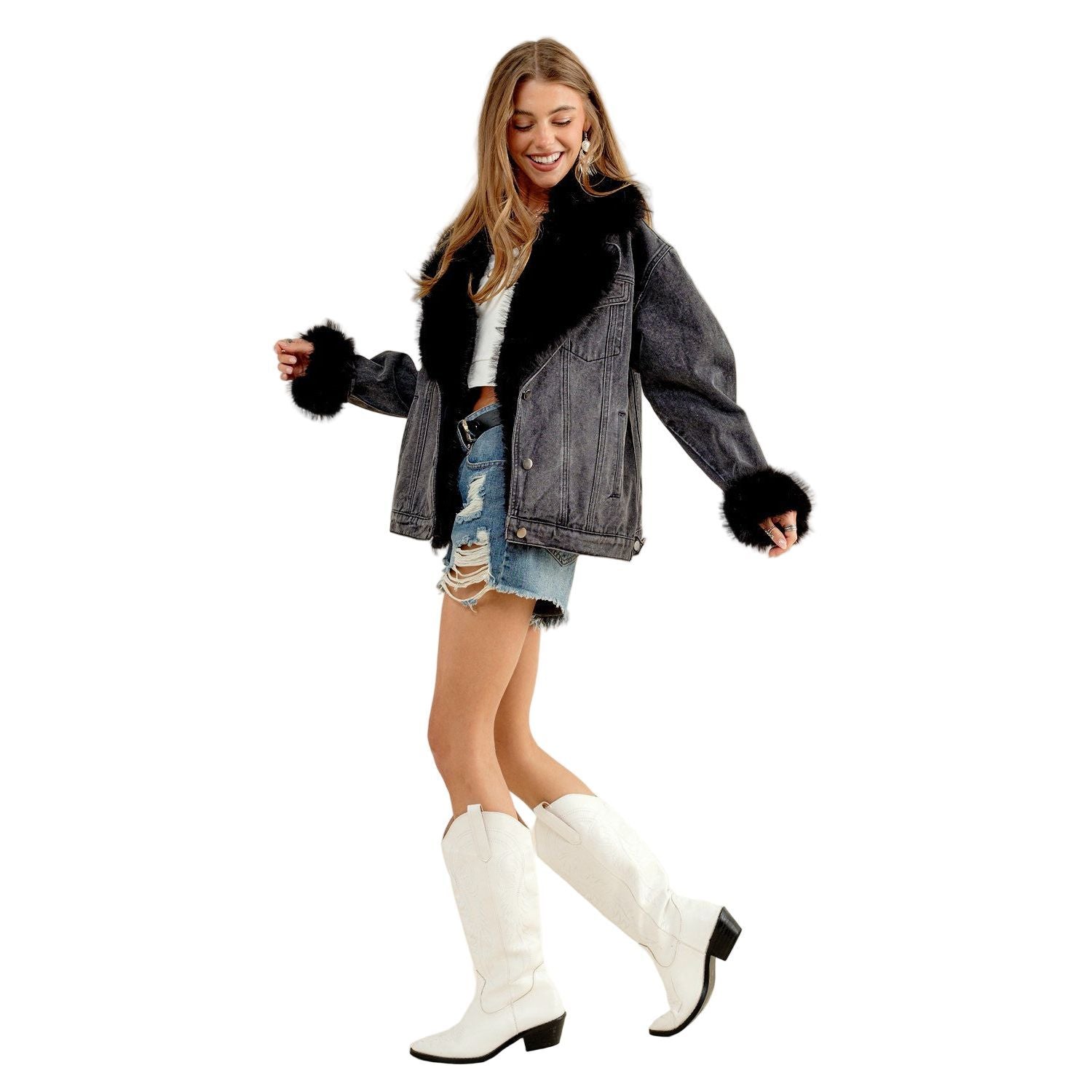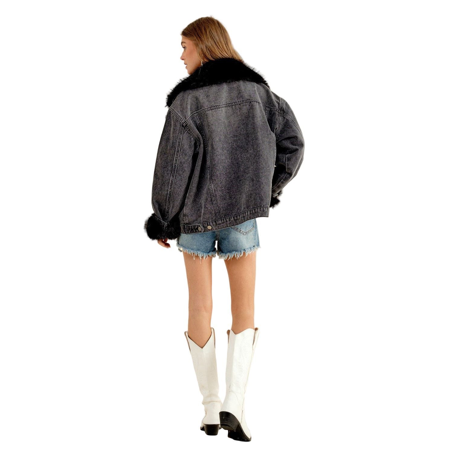 Women's Fur Collard Cuff Over Sized Denim Jacket 15121J