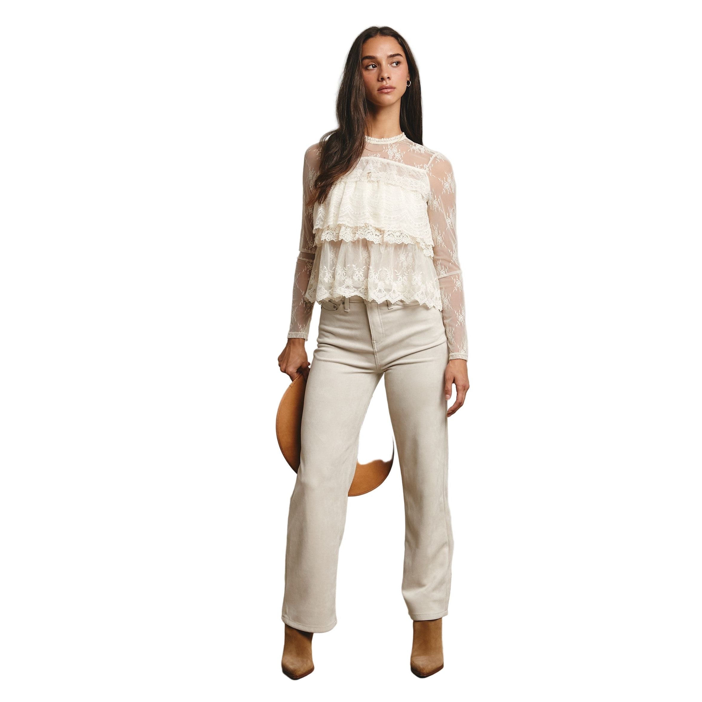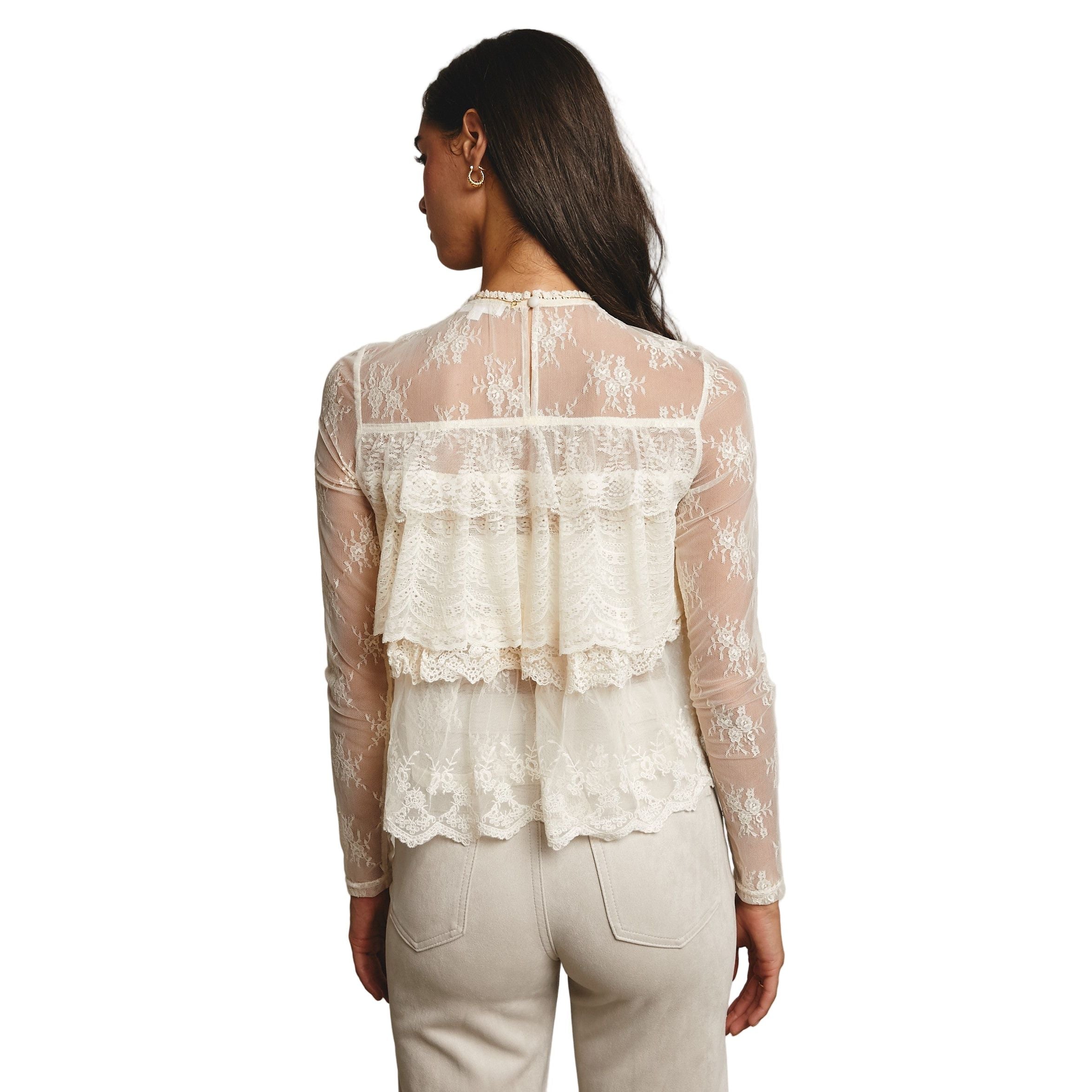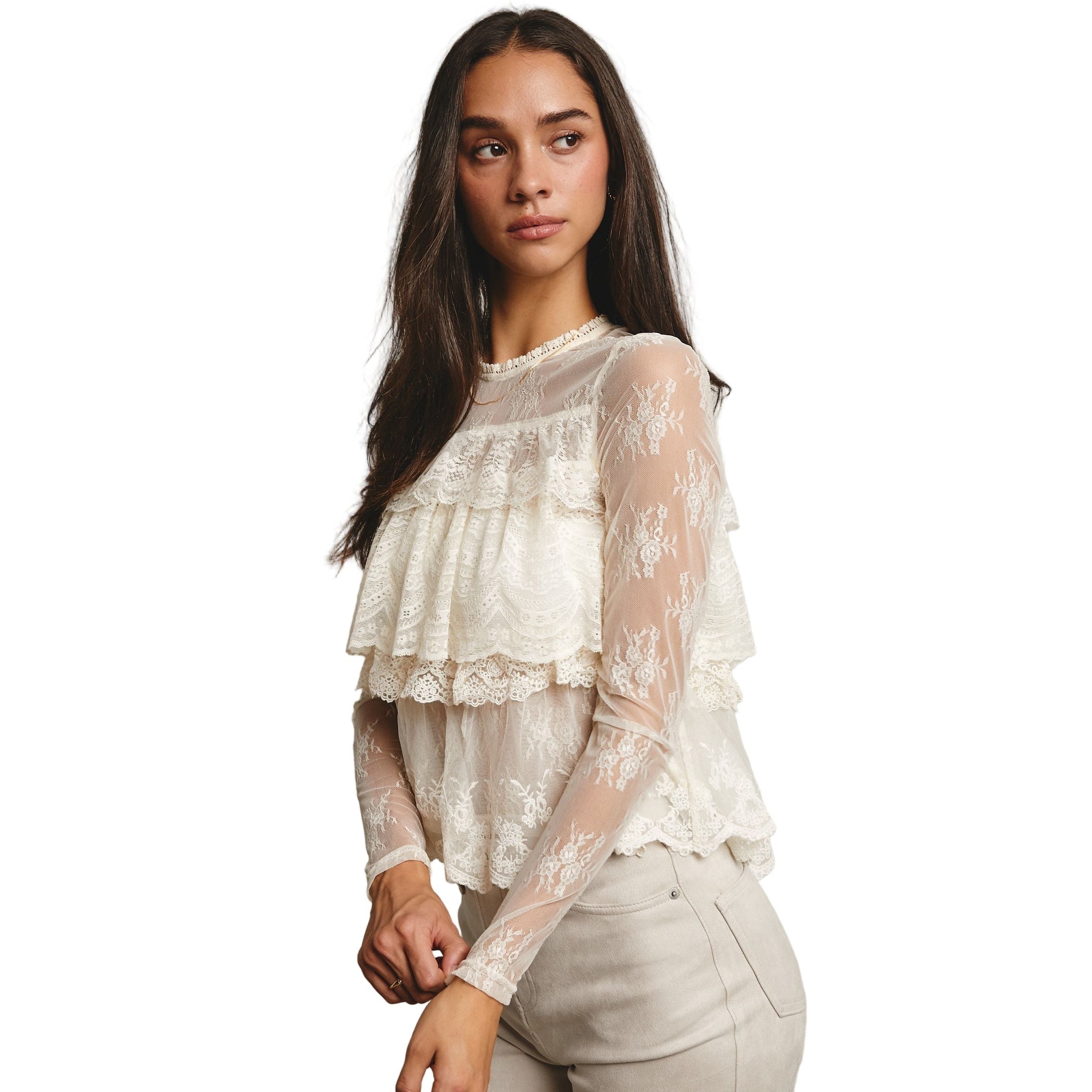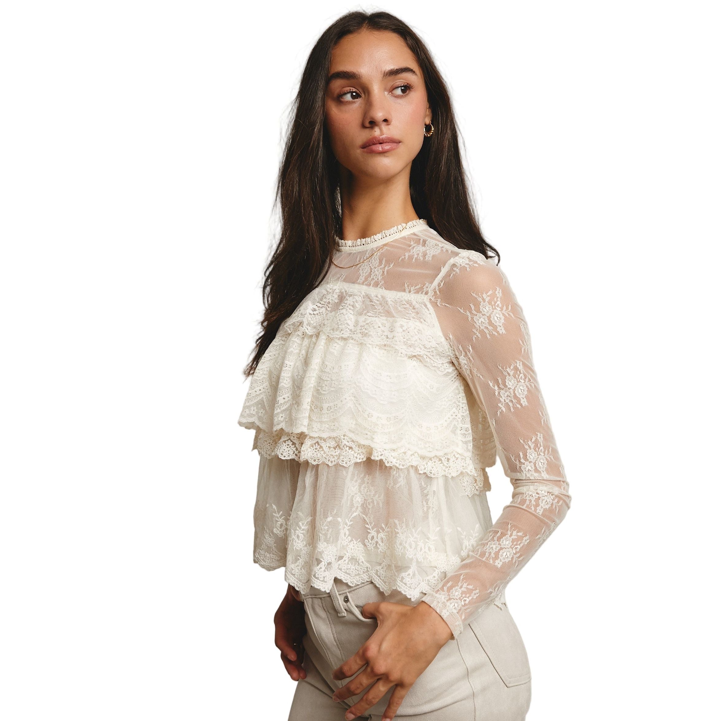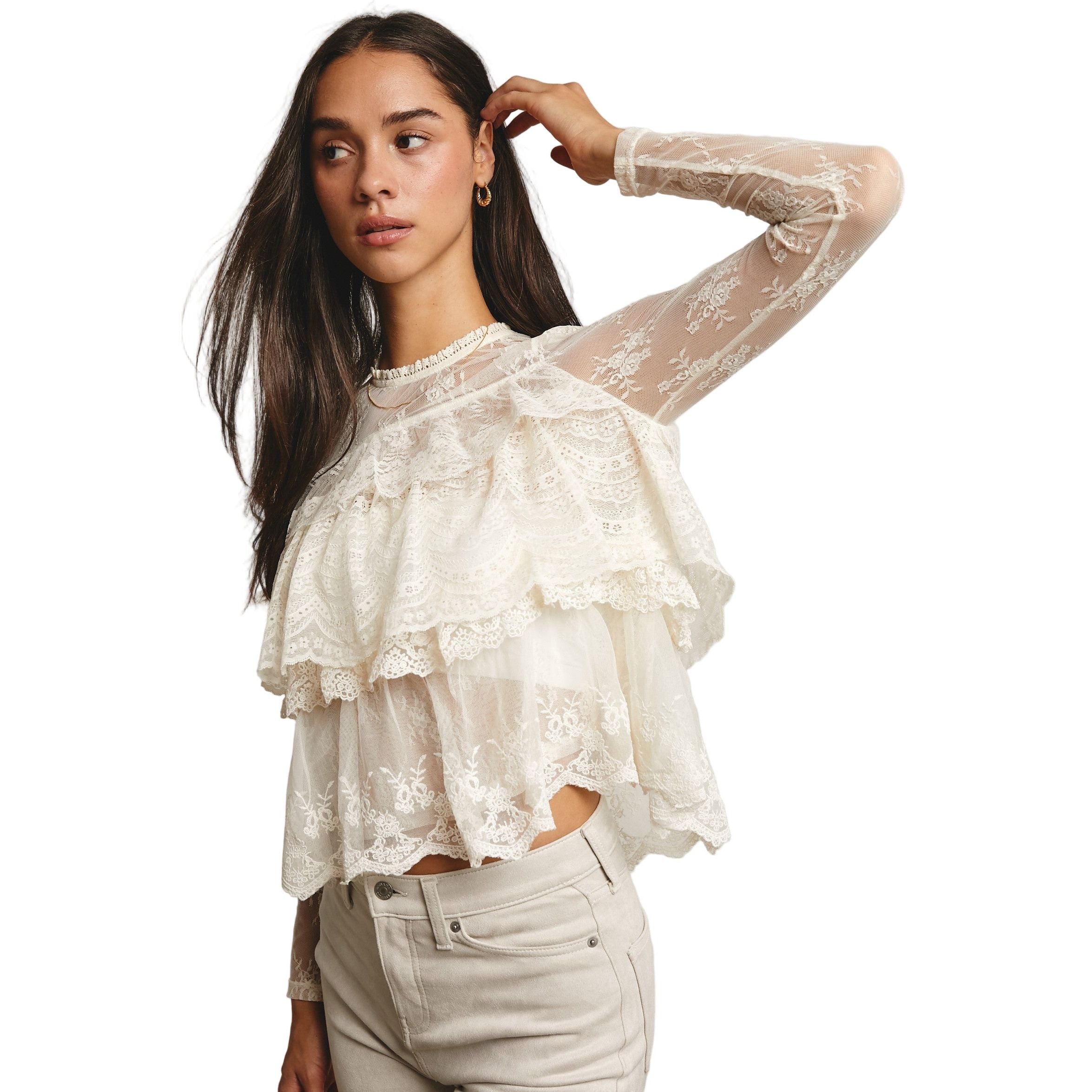 - Sheer Lace Mesh: Lightweight and delicate with embroidered floral patterns throughout - Tiered Ruffle Bodice: Three layers of wide scalloped lace add volume and romance - High Neckline with Trim: Subtle ruffle collar and keyhole back button closure - Long Sheer Sleeves: Fitted mesh arms with dainty hem detailing - Scalloped Hem: Softly flared shape for a feminine finish - Unlined - Model is 5' 9" 32-24-35 and wearing a size Small Ethereal and intricately detailed, this sheer lace blouse is made for layering-perfect over a bralette or under a cropped vest, and pairs effortlessly with jeans, maxi skirts, or even Western-inspired pieces for a look that's both sweet and striking.