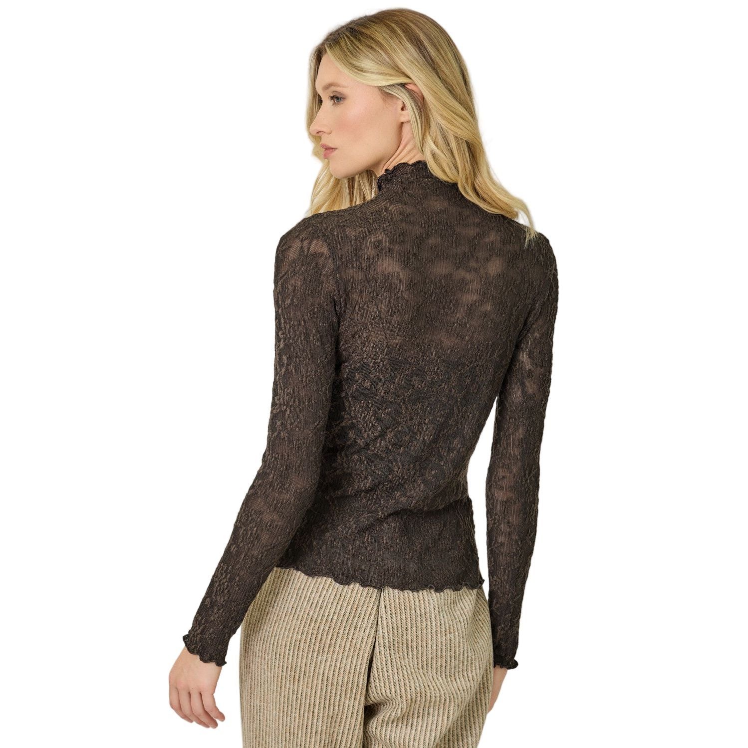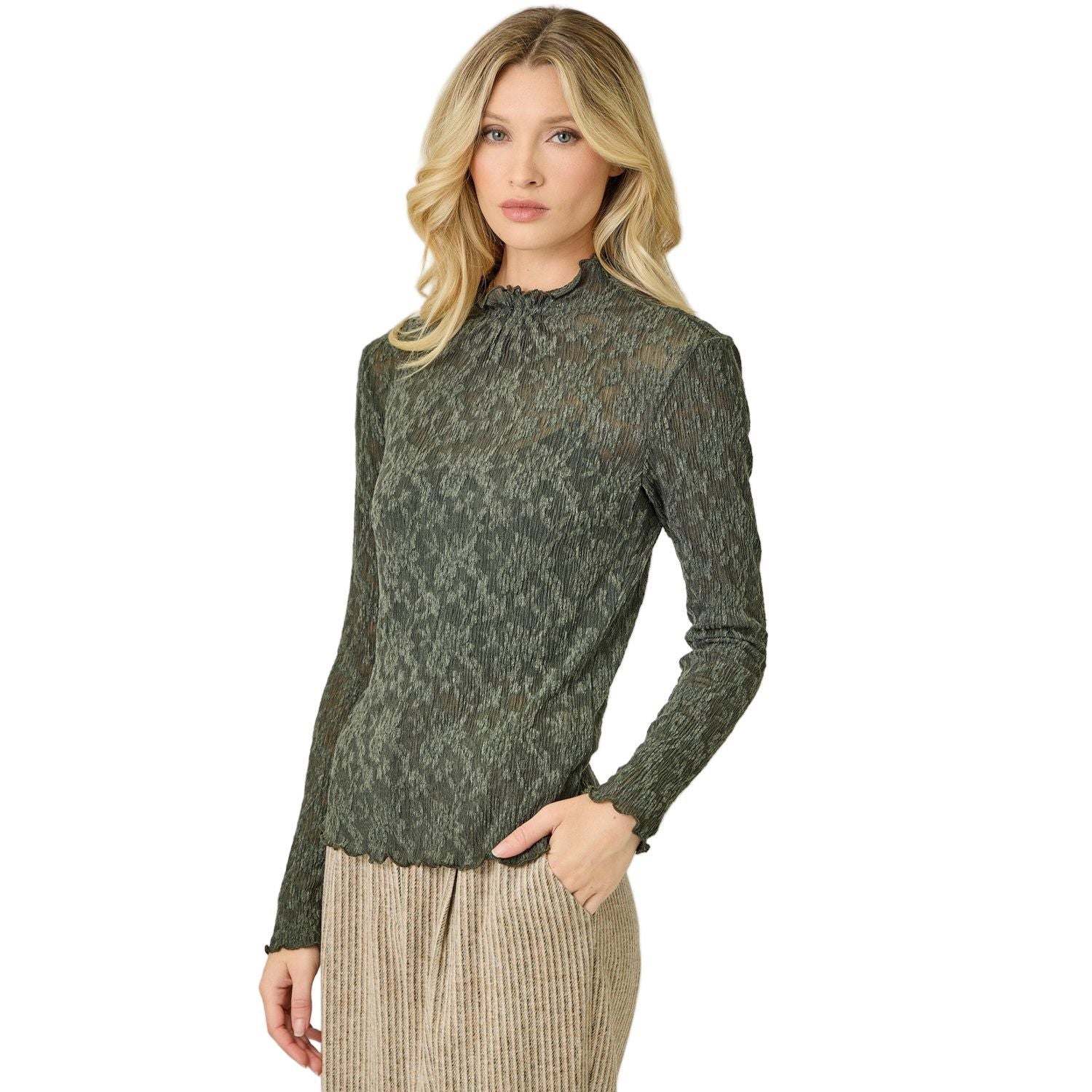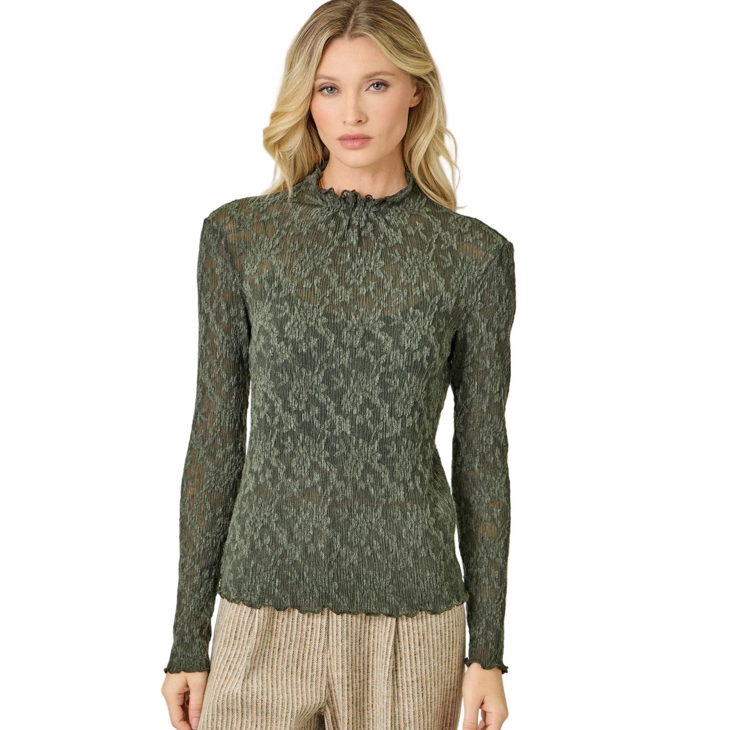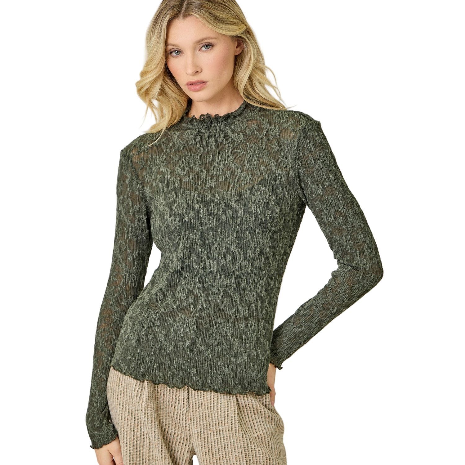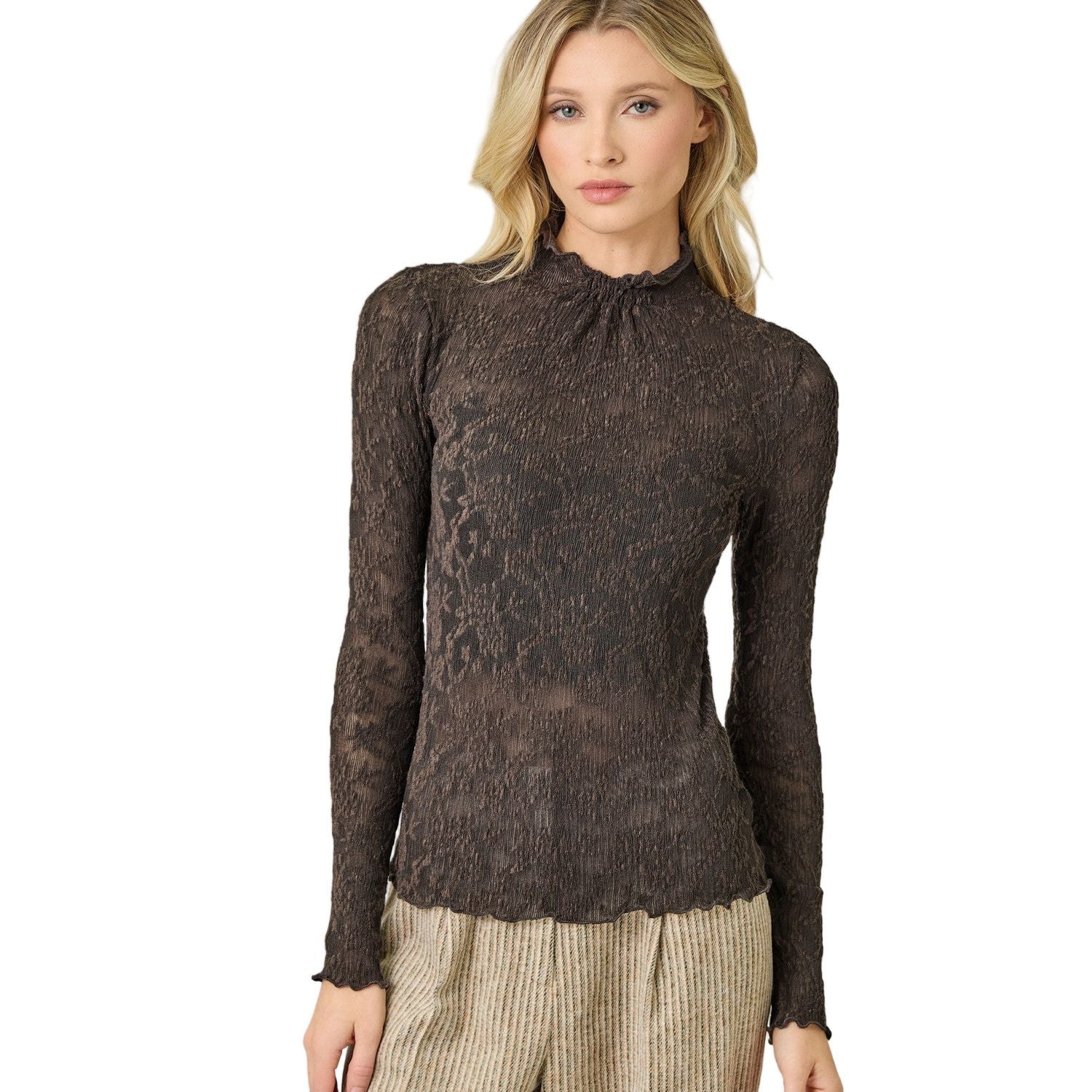 Lettuce Edge Textured Knit Top Fitted Long sleeves Cinched mock neck -95% Polyester, 5% Spandex -Model wears: S / Model height: 5' 9"