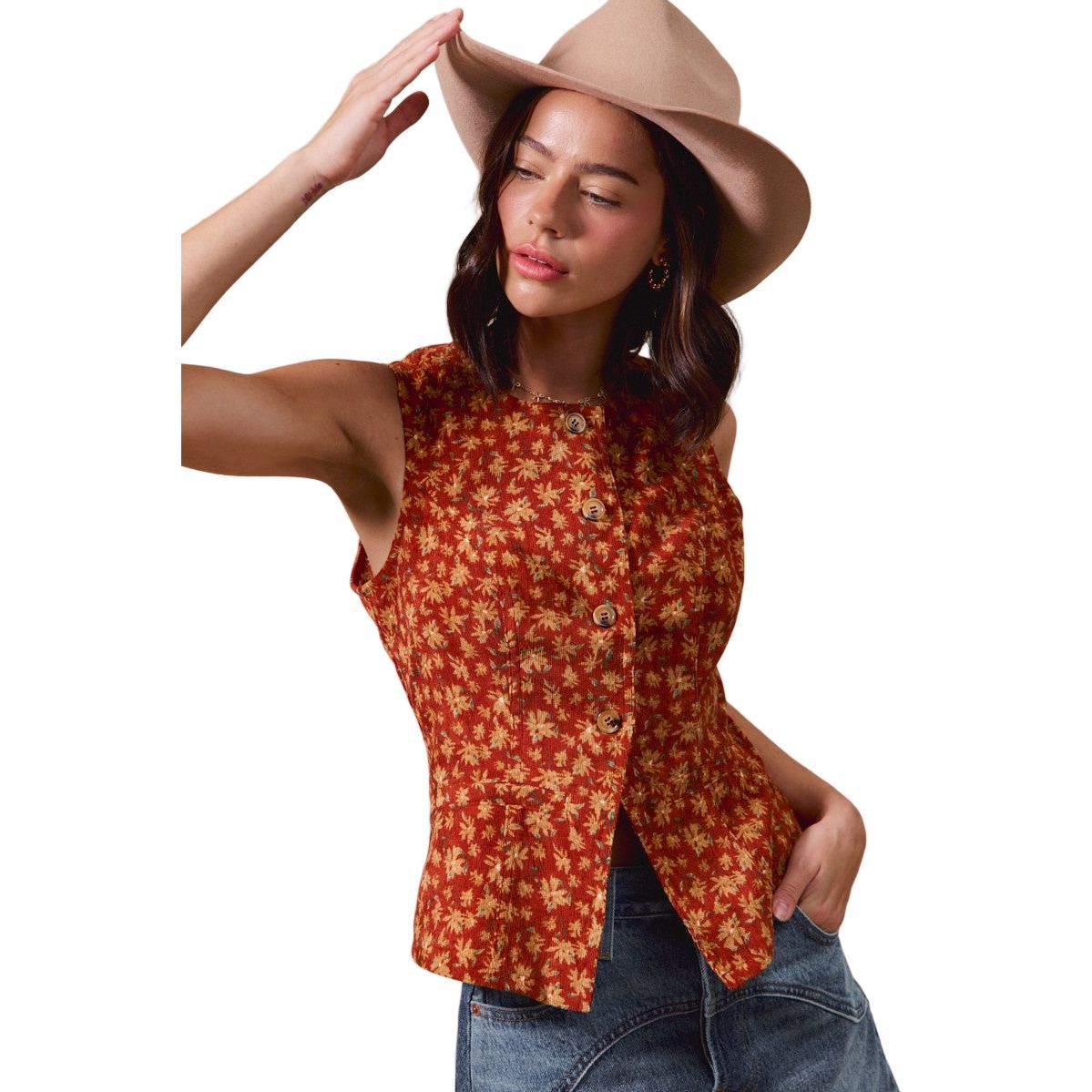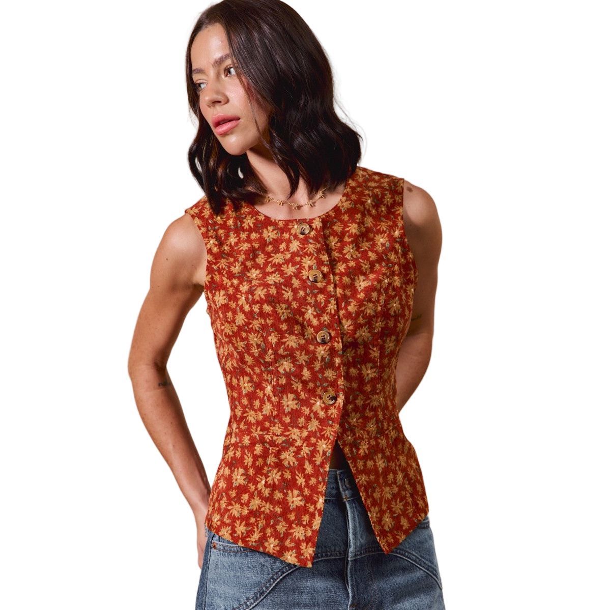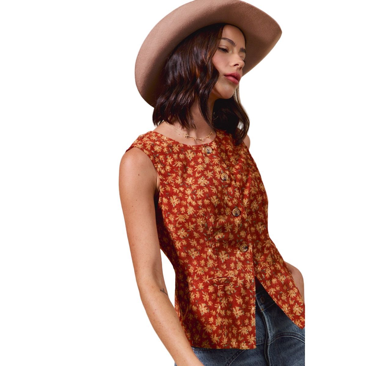 Women's Slim Fit Button Front Floral Corduroy Vest Top ST2710F-05