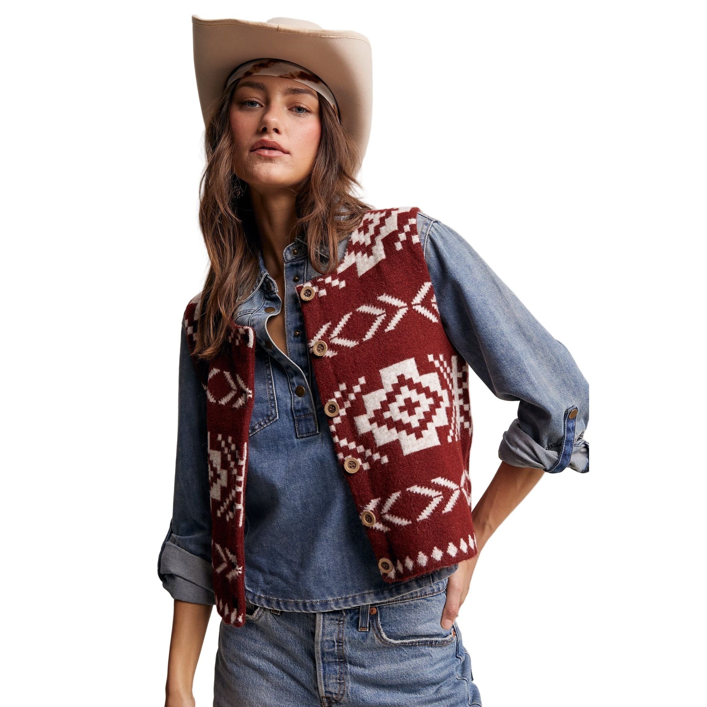 Women's Southwestern Button-up Wool Vest LSW0977-BUR