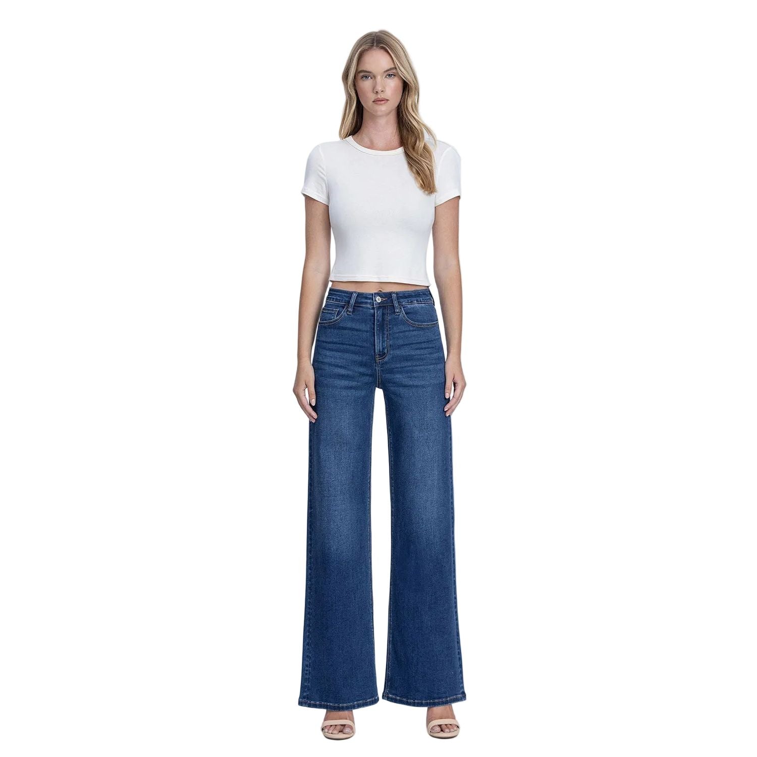 Super high rise super soft wide leg jeans Comfort stretch denim, Super high rise waist, 5 Pockets, Finished hem,