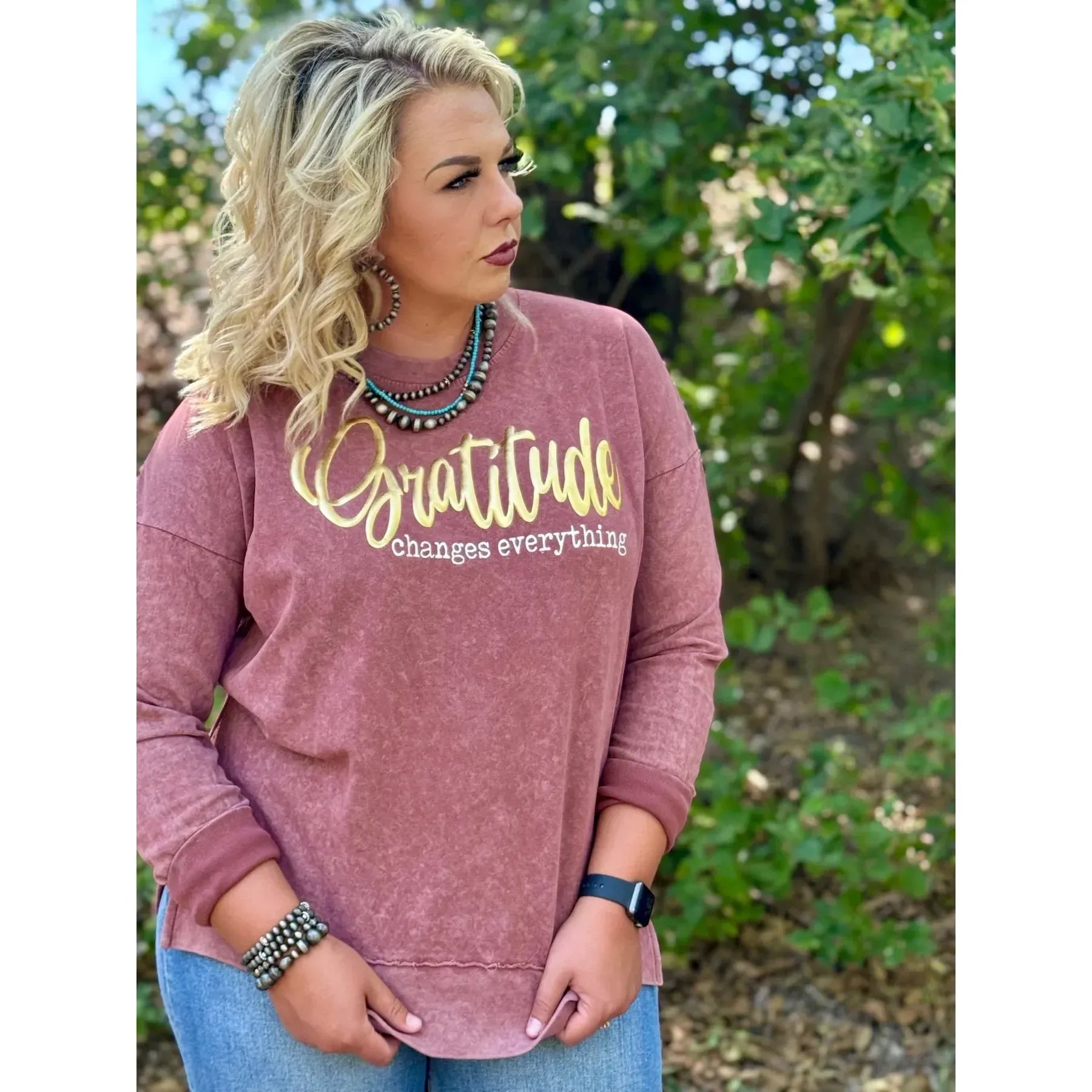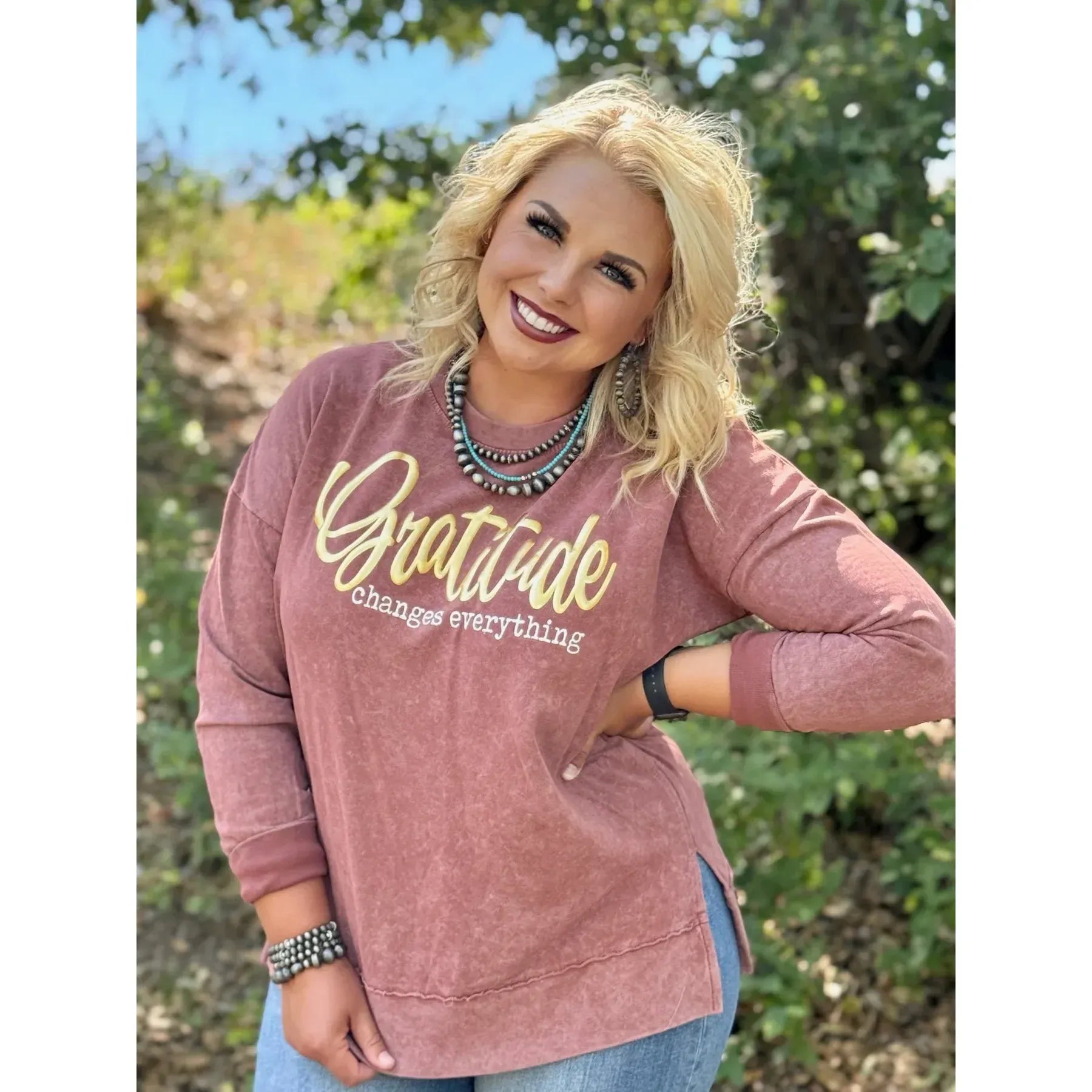 Se muestra en una blusa ligera de manga larga con lavado mineral de arcilla.