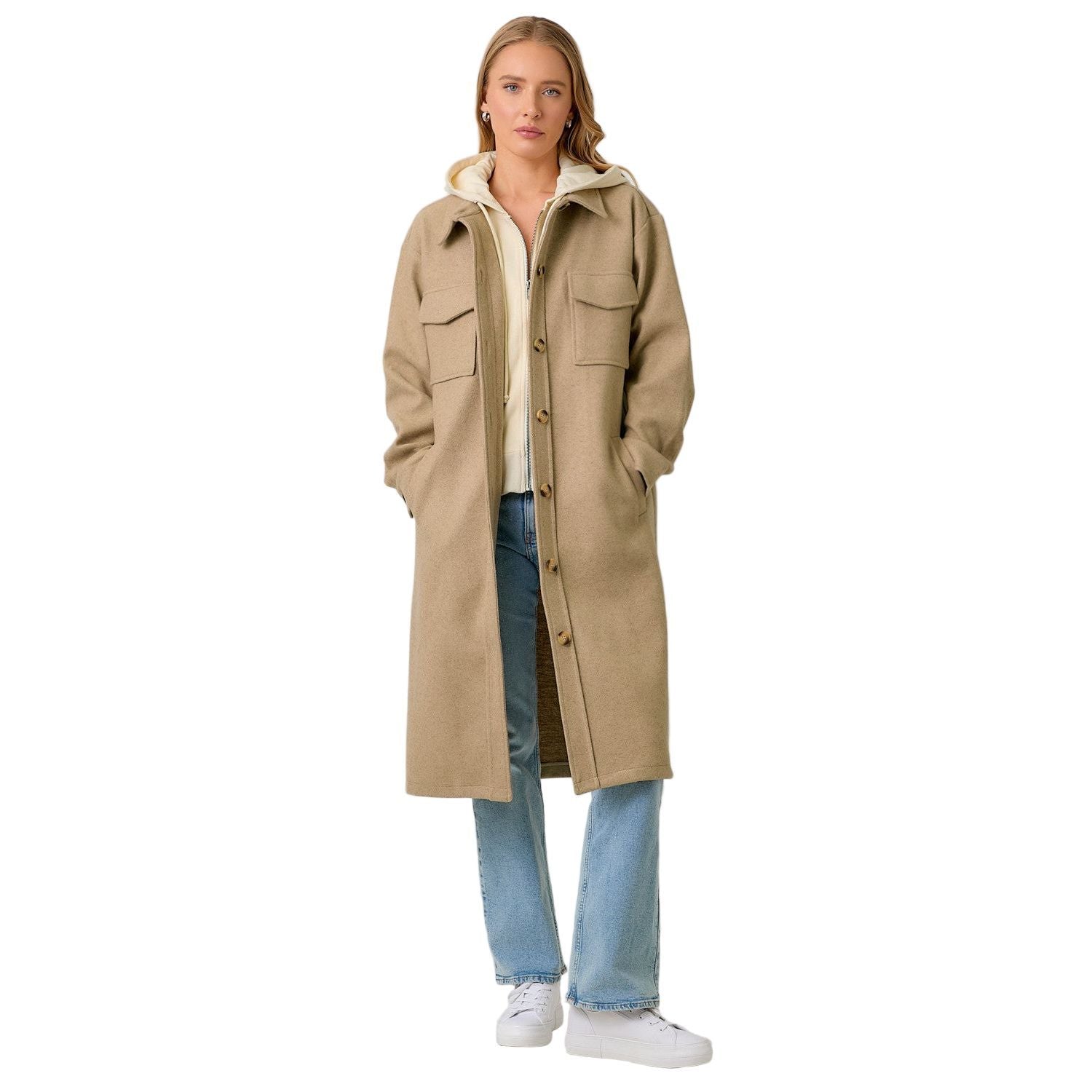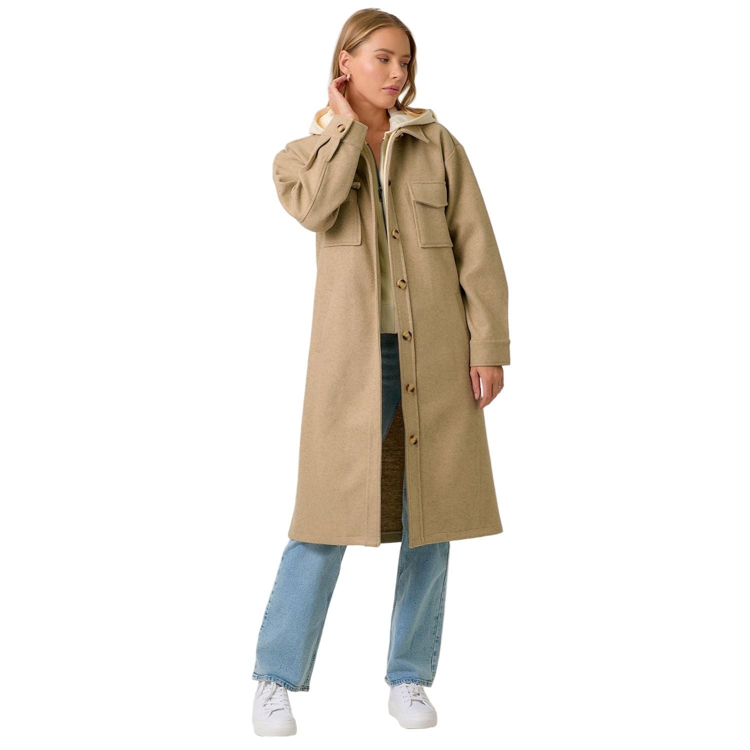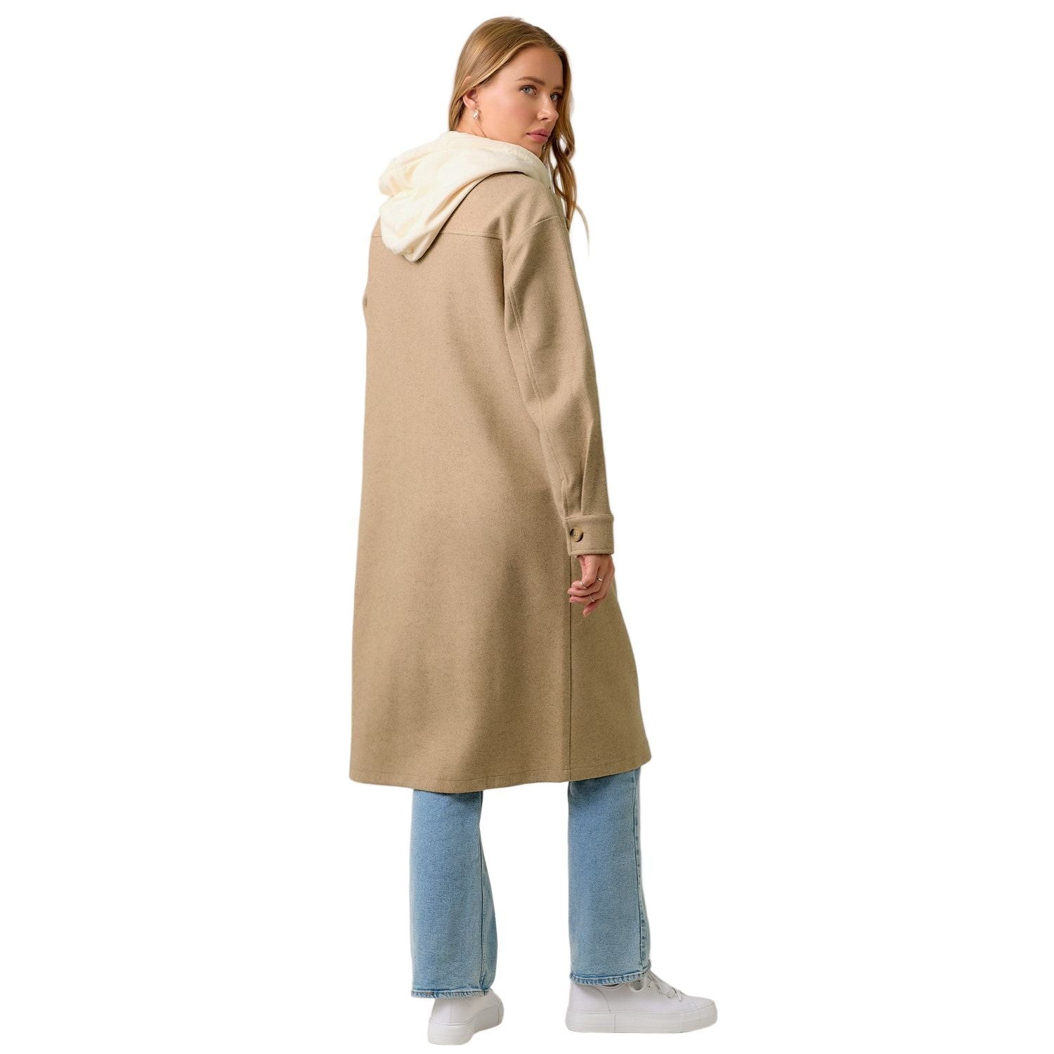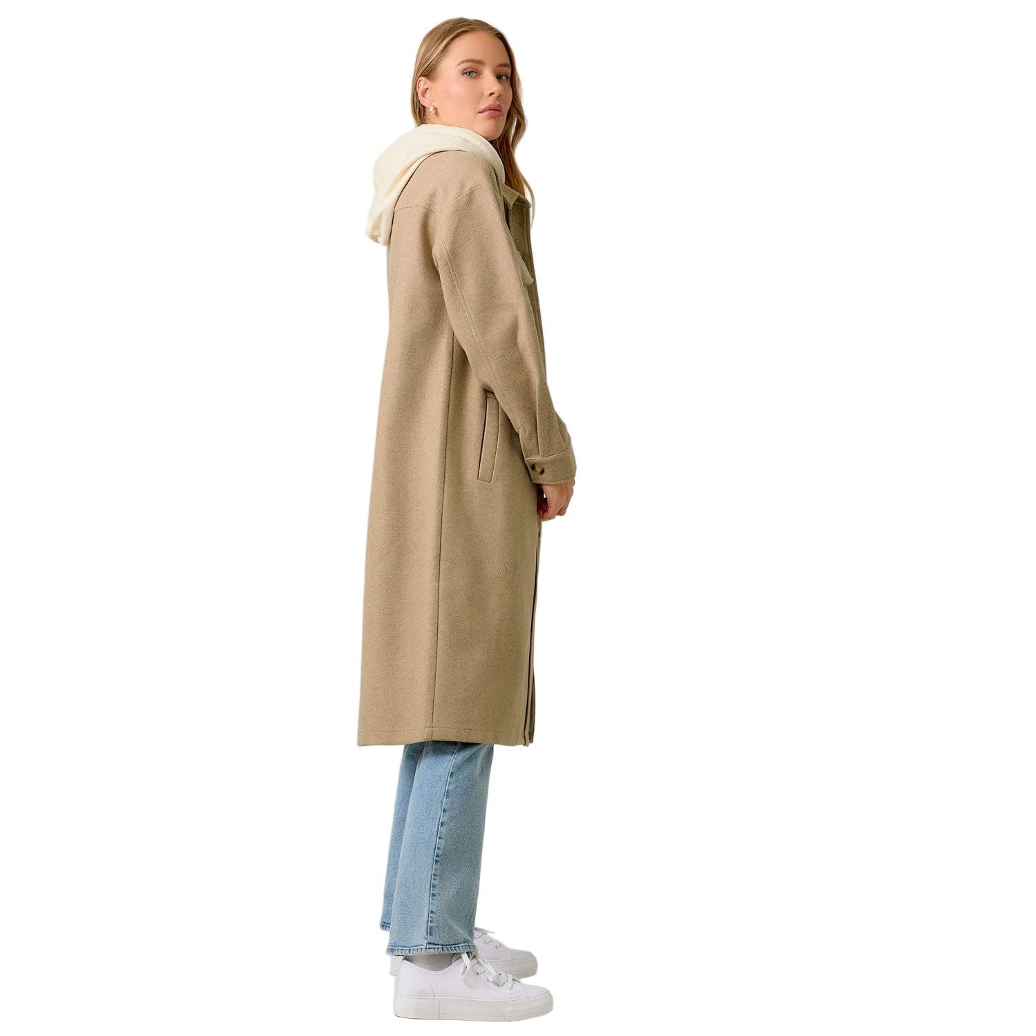 Twofer Hoodie Solid Coat Attached hoodie layer with zipper closure Button down outer layer Bust and side pockets Knee length -Self 85% Polyester, 15% Viscose / Contrast 100% Cotton -Model wears: S / Model height: 5' 9"