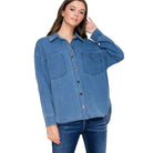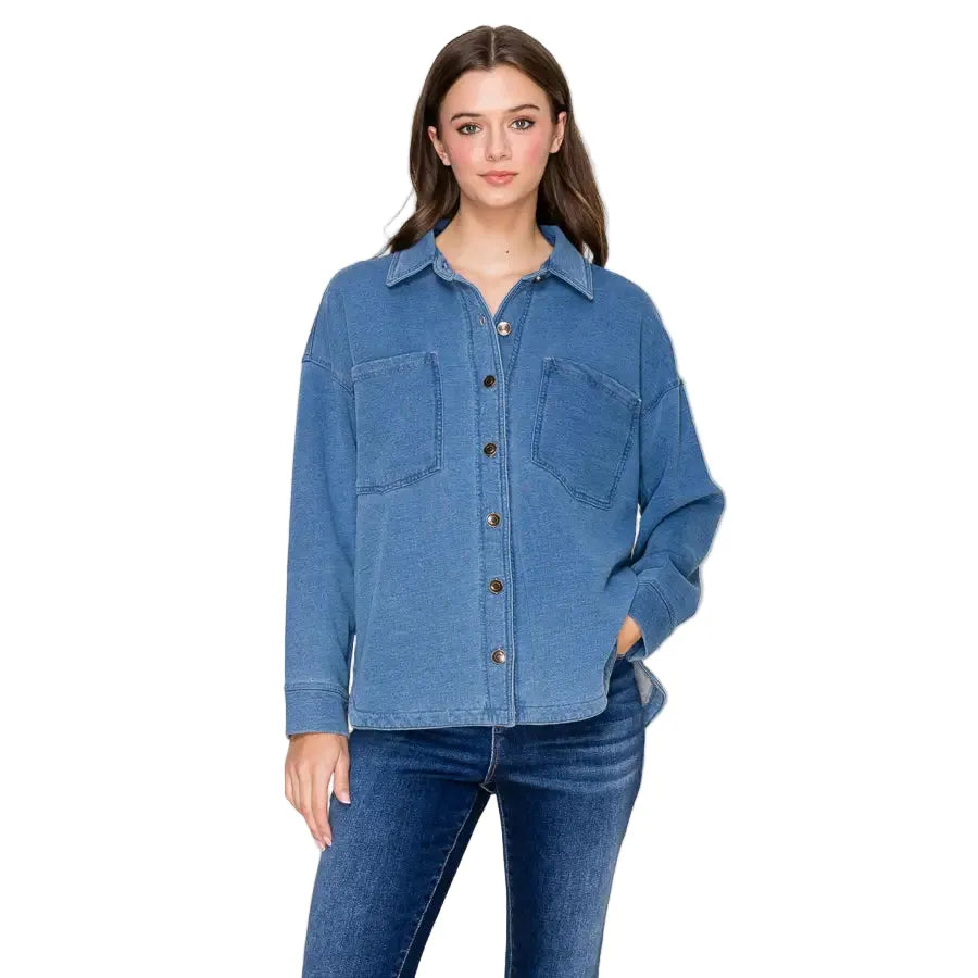 Premium denim terry collared long sleeve button-down top with two pockets ETA: April 2025 S/M/L - 2/2/2 Fabric Content: 54% Polyester 20% Nylon 20% Acrylic 6% Wool Made in China, Designed in Los Angeles