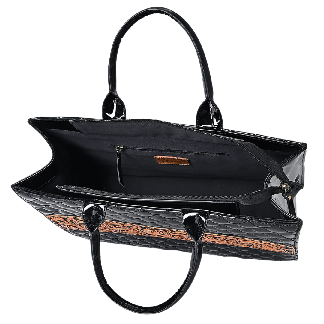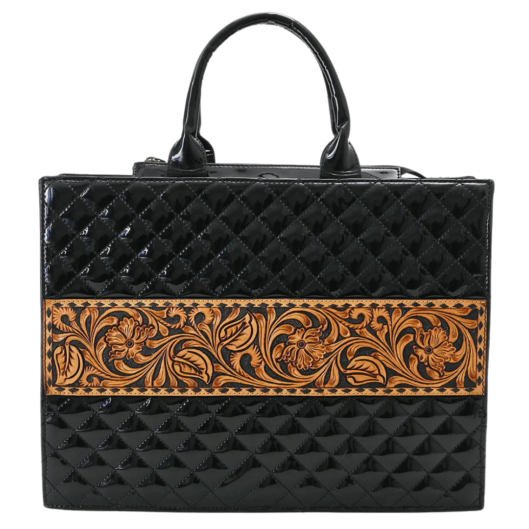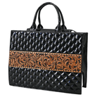 Make a bold Western statement with the ADBGA775 tote bag by American Darling. Handcrafted from genuine full-grain leather, this spacious tote features a hand-tooled floral leather top and a glossy quilted body for a one-of-a-kind look that blends rustic charm with modern cowgirl elegance.