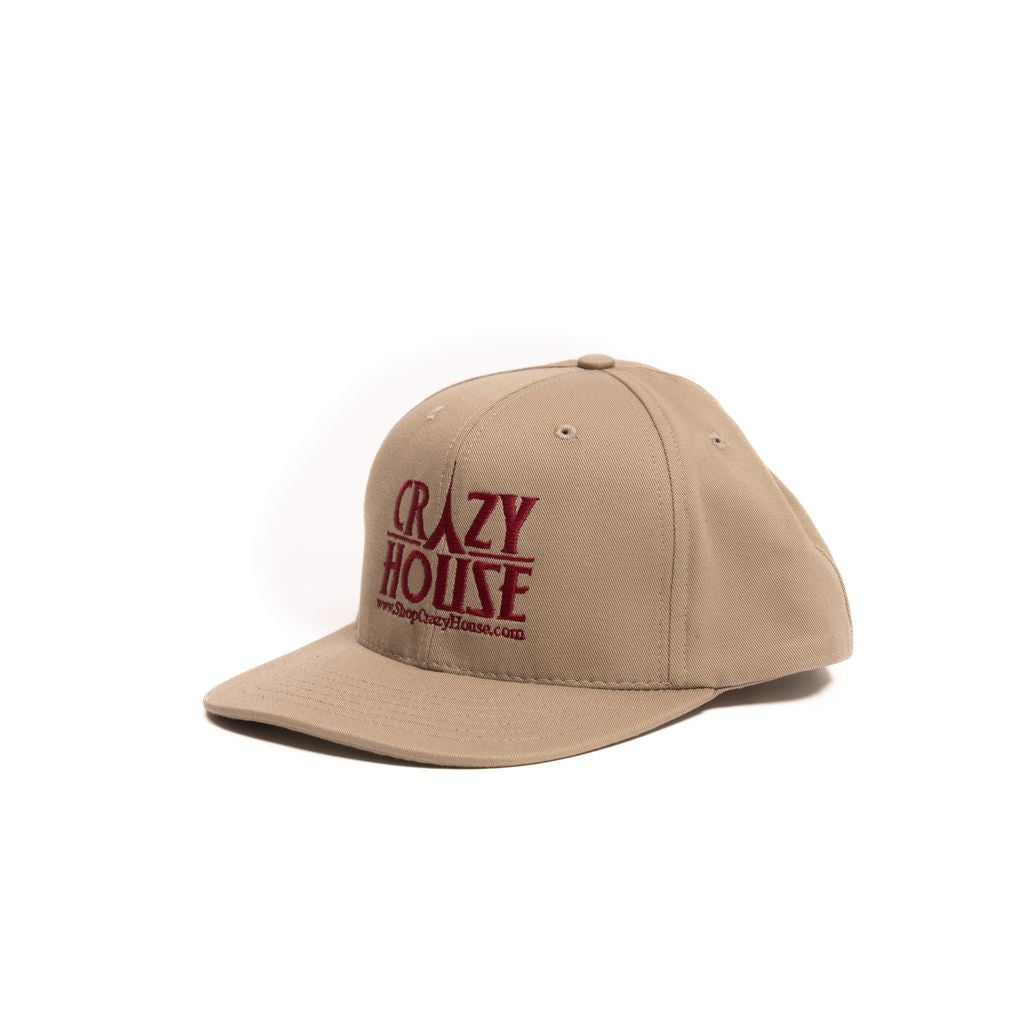 Unisex khaki snapback with burgundy crazy house stitching.
