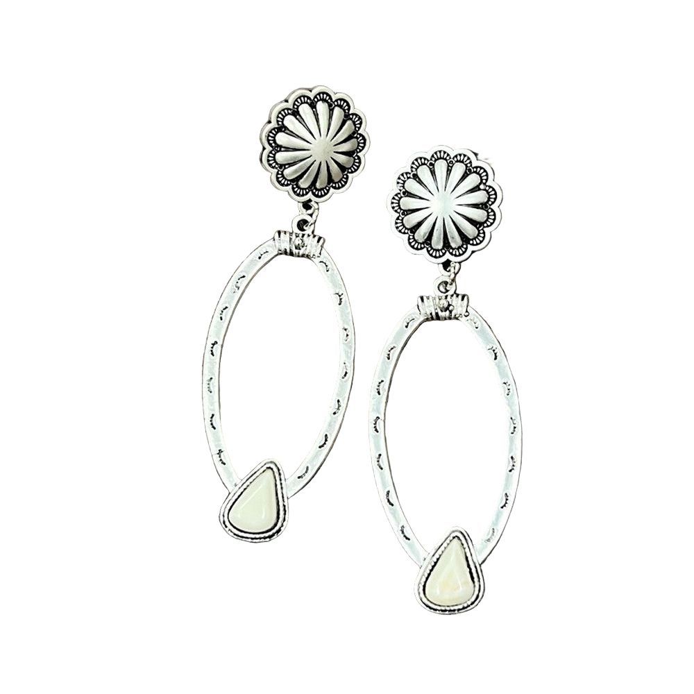 3.2" Long, Aztec White Turquoise Post Earrings * Natural stone may vary in size, color or shape * 3.2" long brass concho post earrings * Each earring 12 grams weight * White turquoise on alloy metal, antique silver plate * Nickel, Lead & Chrome free