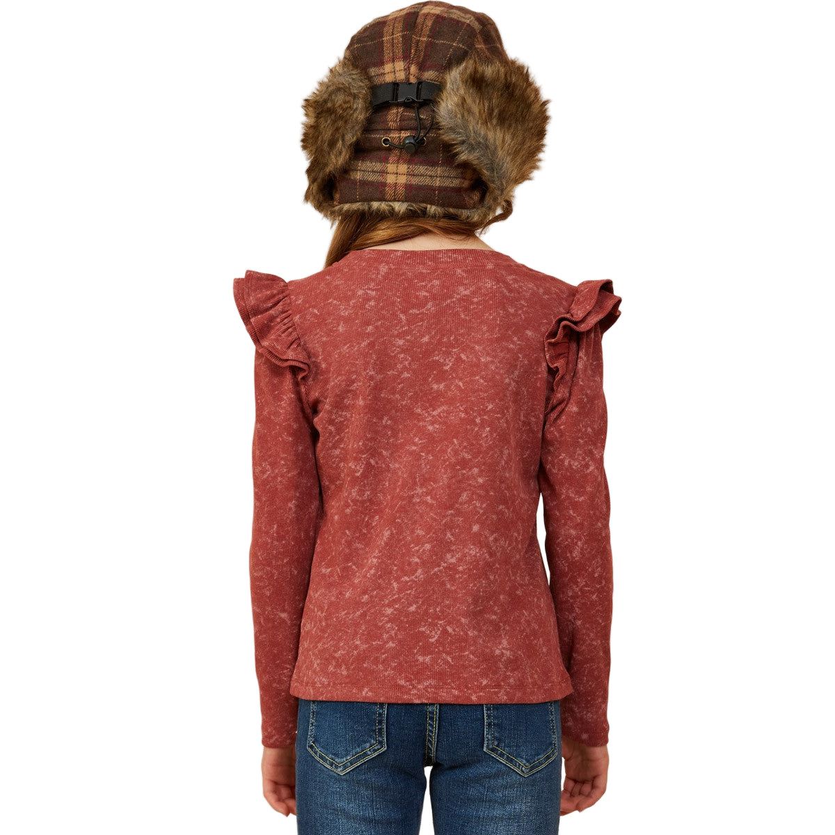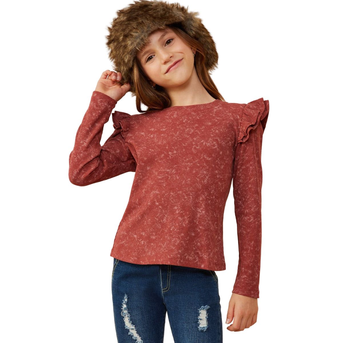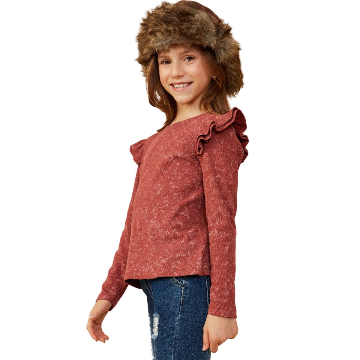 Girls Washed Ruffled Knit Top *Washed Knit Fabric *Round Cut Neckline *Ruffle Detail