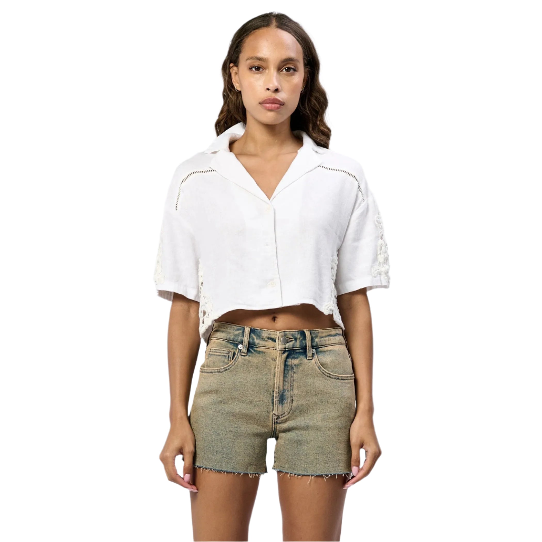 Darby novelty shirt with embroidery sleeve to supplement your wardrobe fashion, a versatile outfit essential crafted for both style and comfort. This button-up short sleeve top features a relaxed fit, offering a relaxed yet chic silhouette perfect for any occasion. Made from a breathable blend of linen and cotton, it ensures you stay comfortable throughout the day, an ideal choice for seeking comfort. Whether paired with jeans for a laid-back look or dressed up with a skirt, this top is the epitome of effortless style.