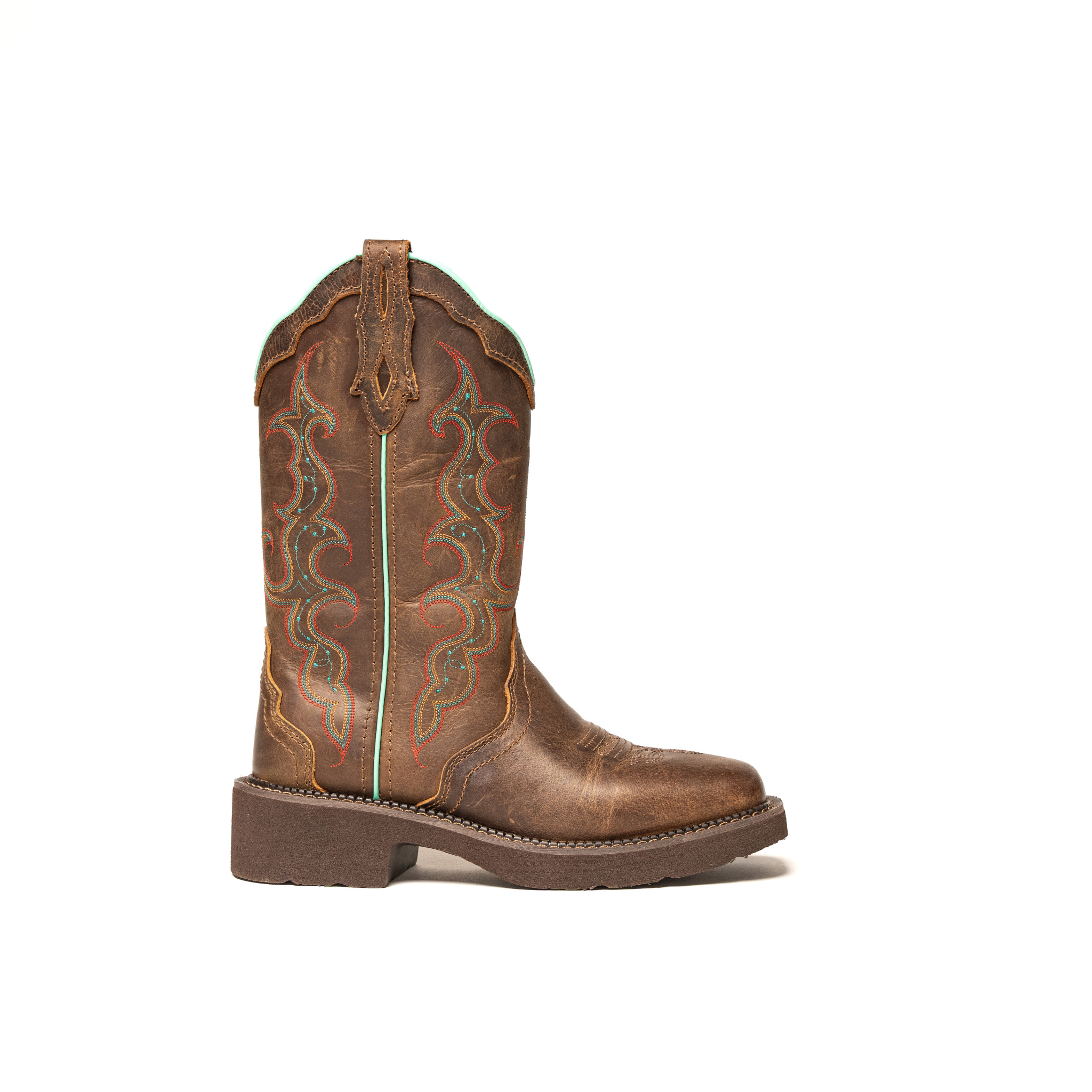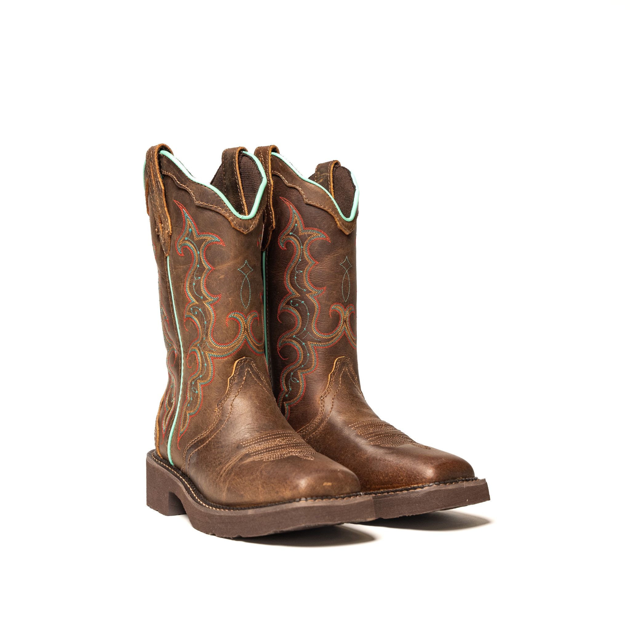 Its leather upper is accented by a delicate stitch pattern and features a scalloped collar for a feminine touch. The distressed golden brown foot gives this boot a vintage feel and sports a square toe. The J-Flex Flexible Comfort System® insole with removable orthotic inserts guarantees lasting comfort for the free spirit ready to run wild.