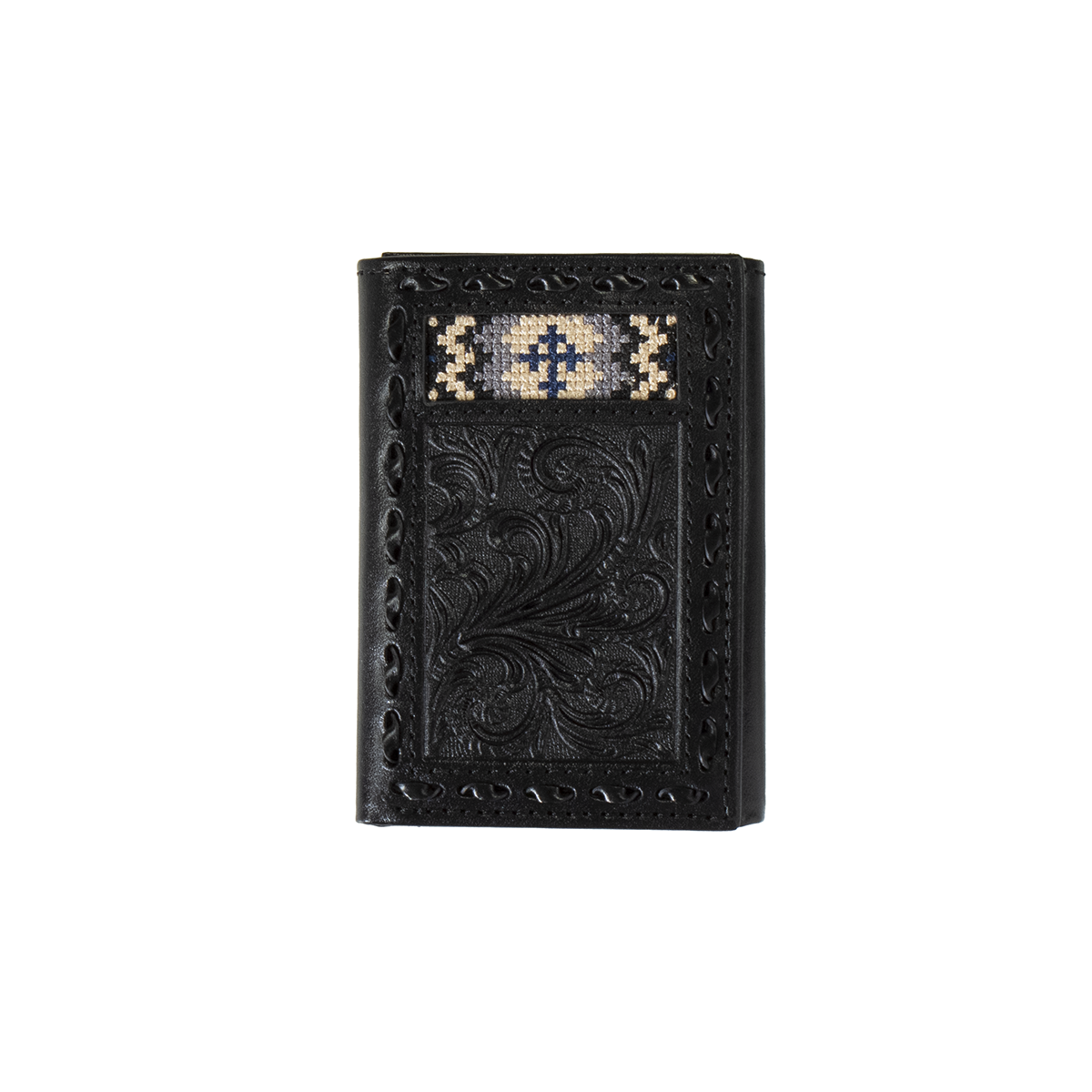 Description: Decorative and stylish men’s 3D trifold wallet. It is made of genuine leather with a floral embossed body trimmed with black buck lace stitching on the edge. Blue and black cross embroidery inlay at the top of the wallet. Multiple card slots and ID window.