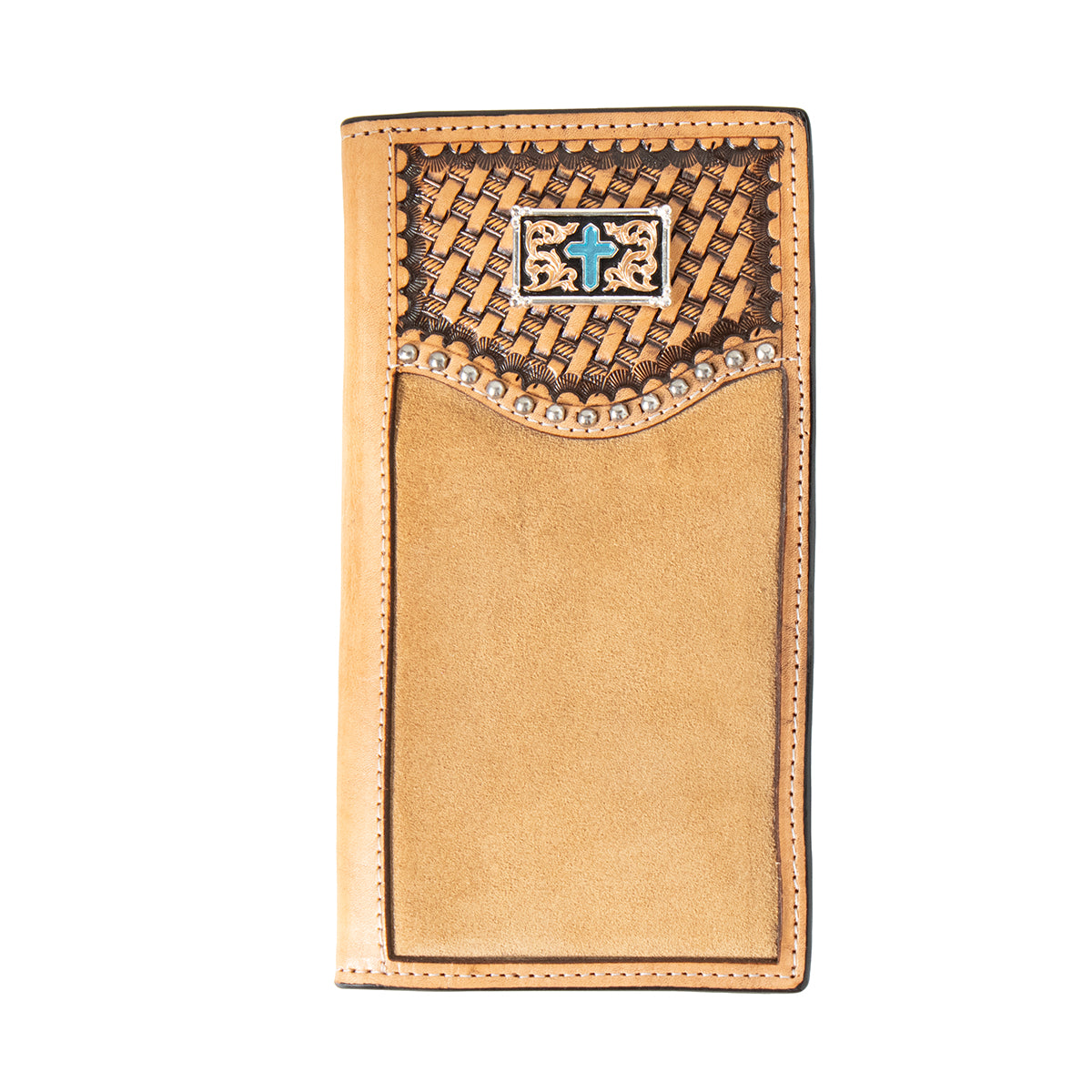 Decorative and stylish mens 3D rodeo wallet. It is made of genuine tan leather with a hand tooled basket weave and sunburst design. There is an antique silver concho with a turquoise Cross in the center. Multiple cash and card slots along with a checkbook slot and ID window.