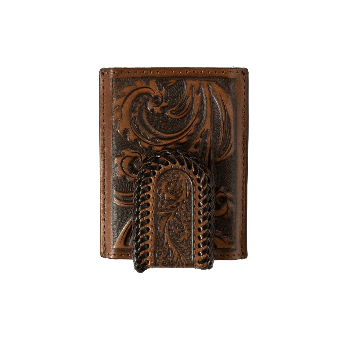 Decorative and stylish mens 3D utility wallet. It is made of genuine leather and has an embossed scrolling pattern on the front and tab. Trimmed with braided chocolate edge lacing. Magnetic money clip on the front and a plastic push lever on the back.