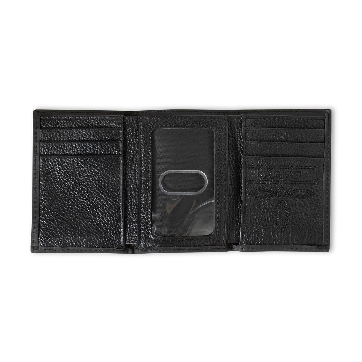 Ariat trifold wallet by M&F Western Products. This great wallet has a black, white and grey southwest cotton fabric on the front along with a rubber Ariat patch. White diamond lacing trim around the edges. Multiple card slots along with a cash slot and ID window.