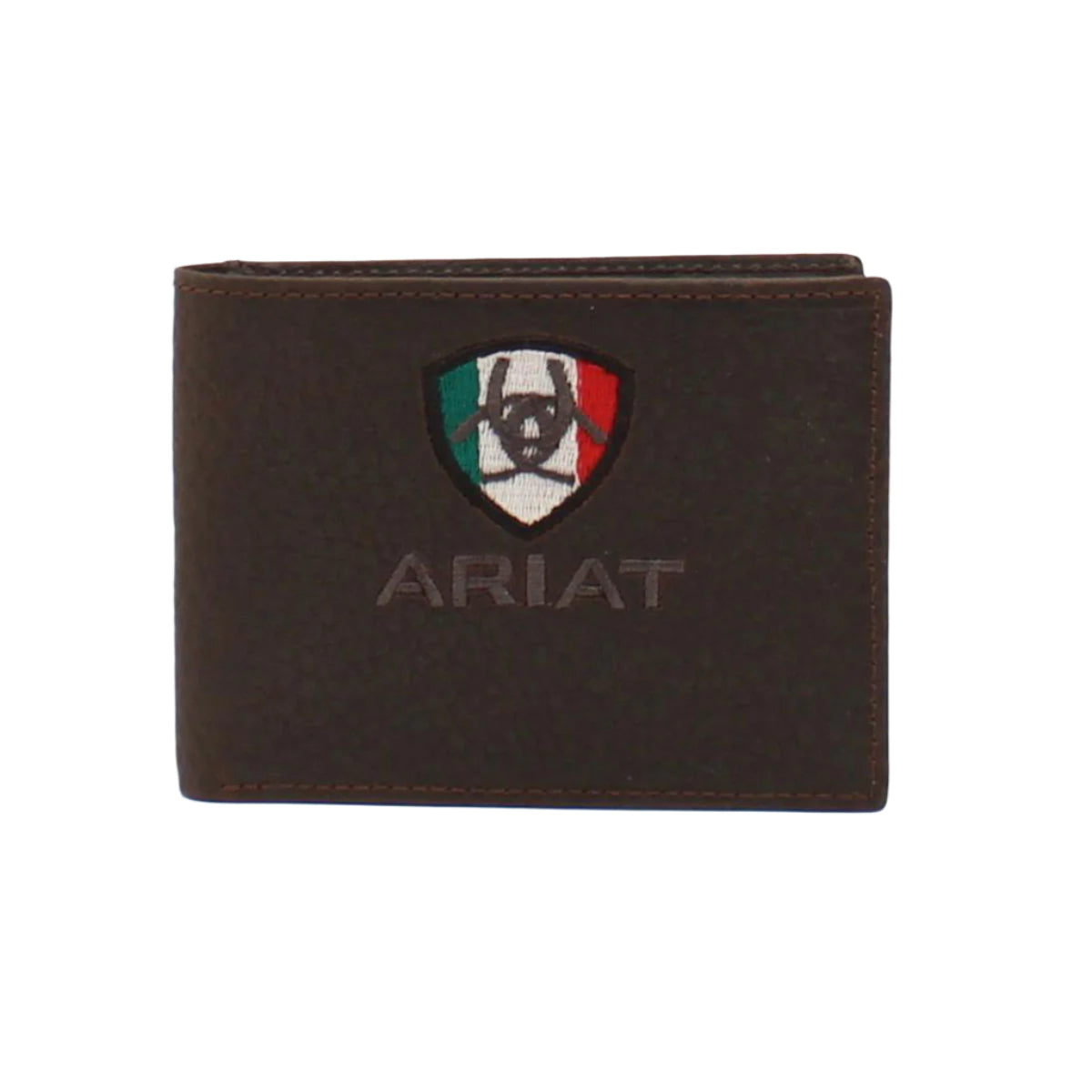 Description: Stay both organized and in style with this Ariat bifold removeable pass case wallet by M&F Western Products. Brown rowdy leather with embroidered Ariat shield and text logo and a Mexico Flag. Features multiple compartments for your credit cards, cash and ID.