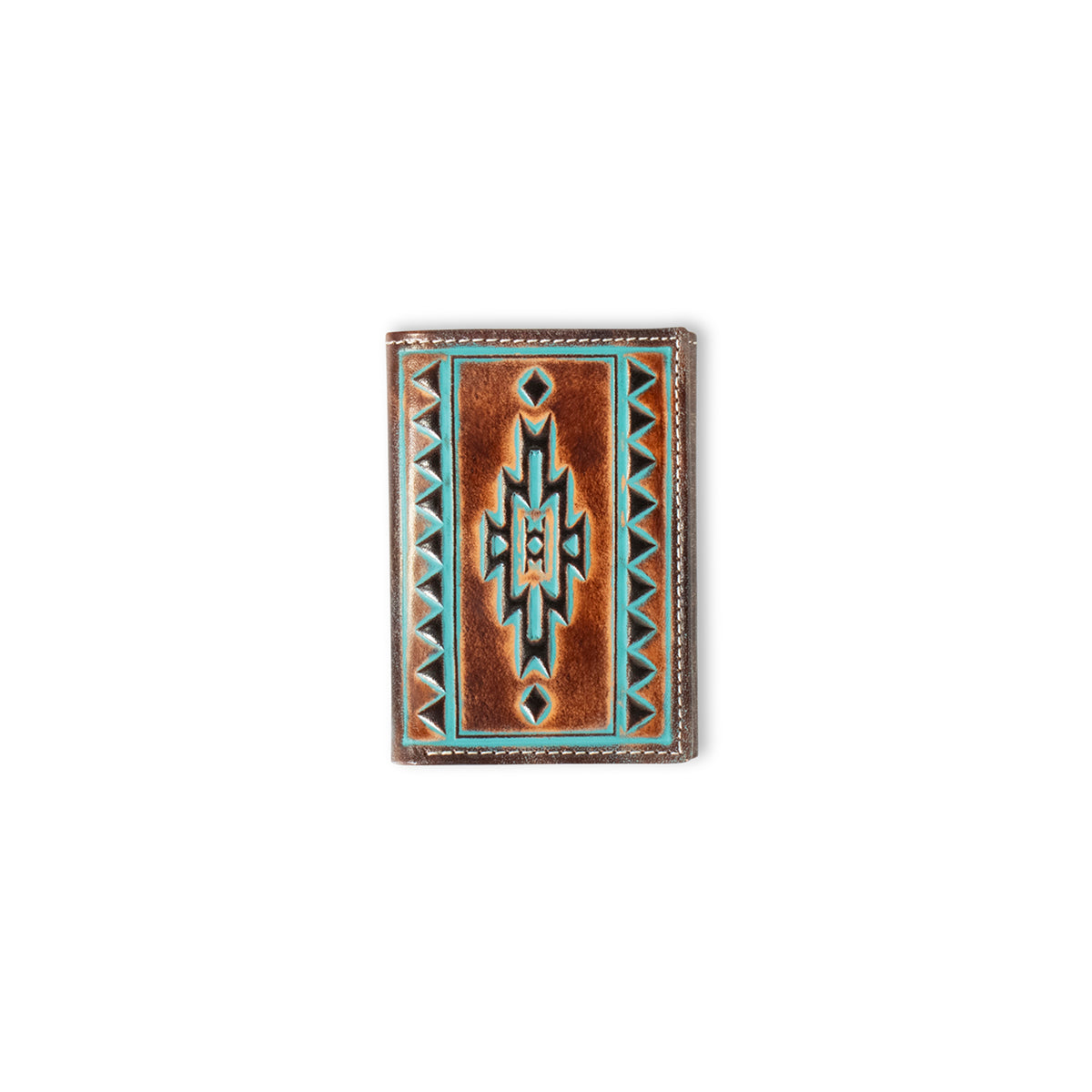 Ariat trifold wallet by M&F Western Products. This great wallet has a southwest embossed pattern that is trimmed in turquoise. Multiple card slots as well as a cash slot and ID window.