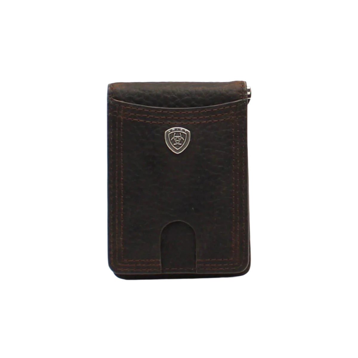 Description: This Ariat bifold money clip by M&F Western Products is brown leather with an Ariat shield concho. Slim design, so perfect for the guy who doesn’t want to carry a large wallet.