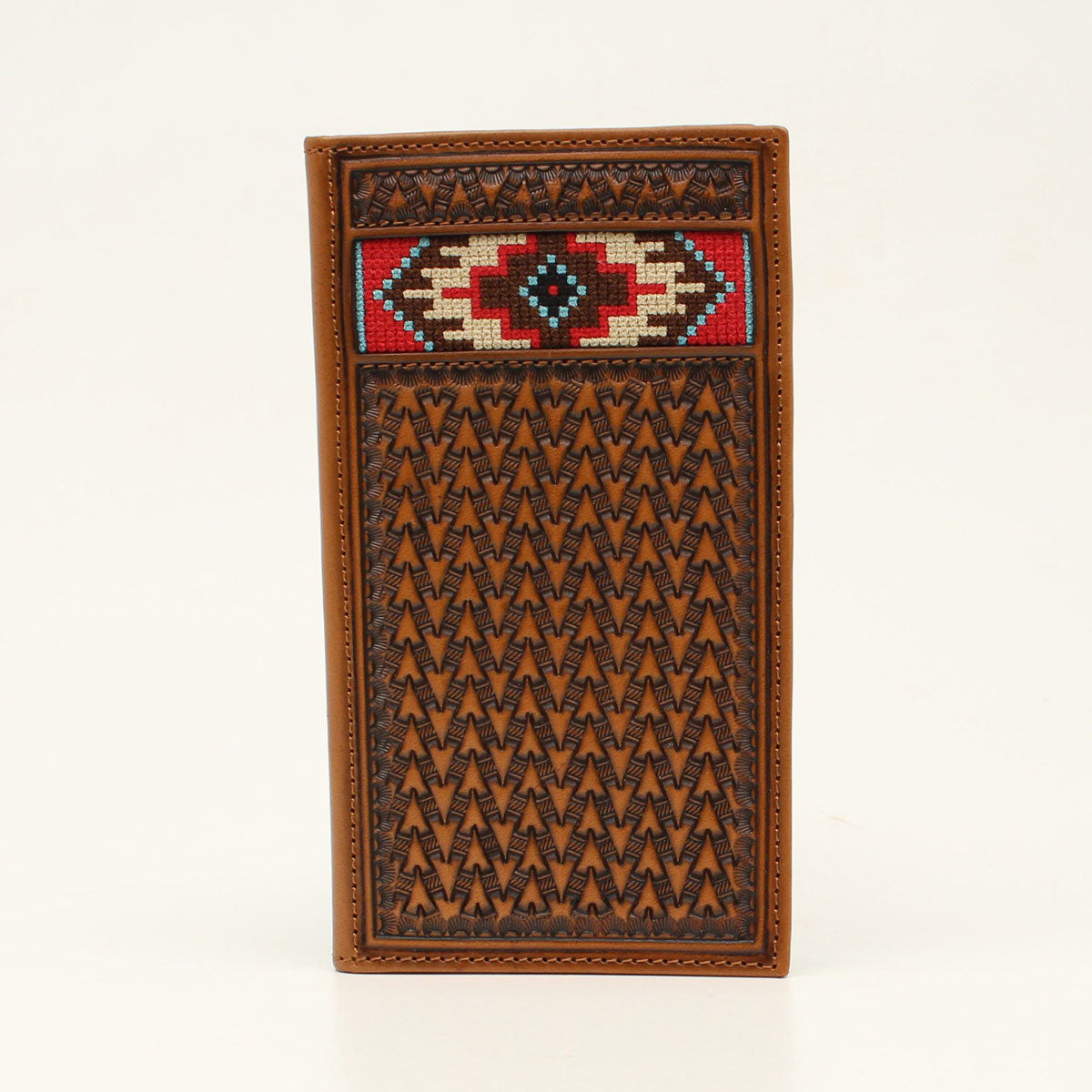 Description: Keep your checkbook, credit cards and cash organized in one place with this Ariat rodeo wallet by M&F Western Products. This great wallet is made of genuine leather and features a tan embossing with multi colored southwestern embroidered ribbon inlay. Inside features multiple compartments for your credit cards, cash, and an ID window.