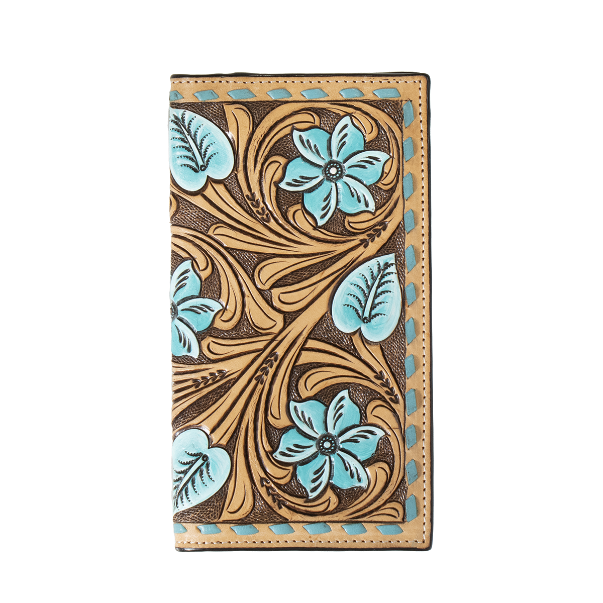 Decorative and stylish men’s 3D rodeo wallet. It is made of genuine leather with dark brown staining and a hand tooled floral design. Turquoise accents and a turquoise twisted buck lace stitching along the edge. Tan interior. Multiple card slots and ID window.