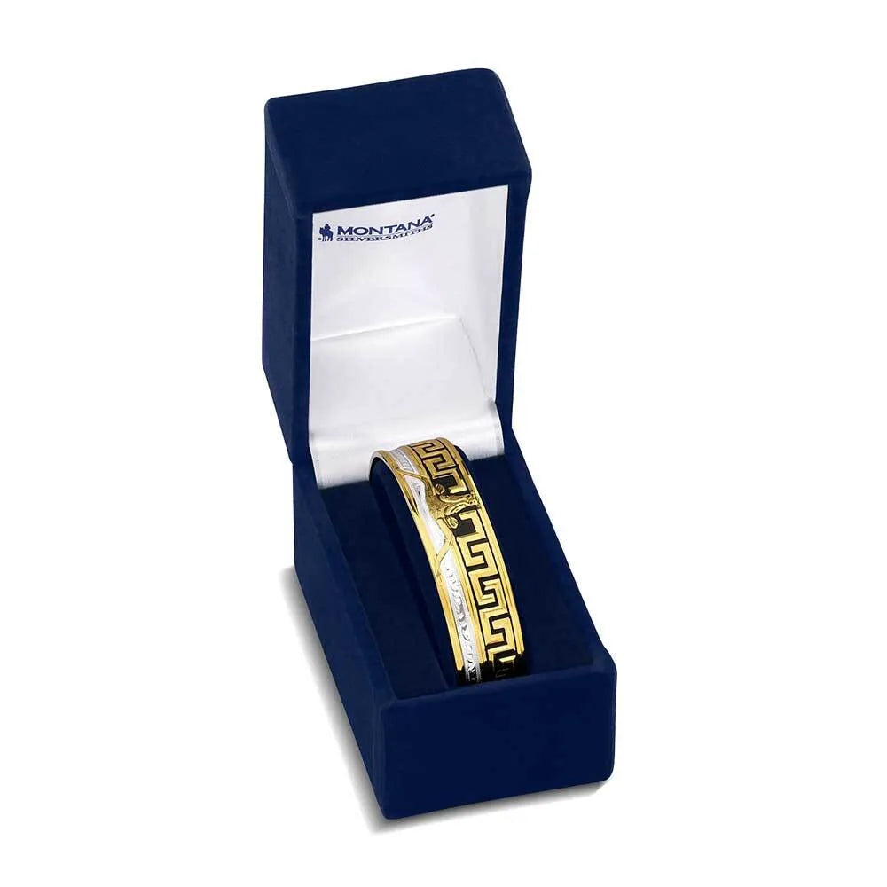 Take the spirit of the Southwest with you wherever you go with the Sunrise Mesa Longhorn Cuff Bracelet. This bracelet features a captivating geometric pattern that runs along the bracelet in a yellow gold tone and black paint. Bright cut engravings sit just above the design adding contrast and acting as a background for the antiqued yellow gold tone longhorn figure. One size fits most.