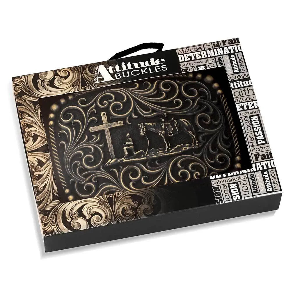 At the heart of this square buckle is a powerful image of a cowboy kneeling in prayer before a cross, with his loyal horse standing behind him. Bold, flowing filigree surrounds the central scene, adding depth and movement to the design. A classic roped edge and beaded corners frame the piece, offering a polished and reverent finish. Standard 1.5 inch belt swivel.